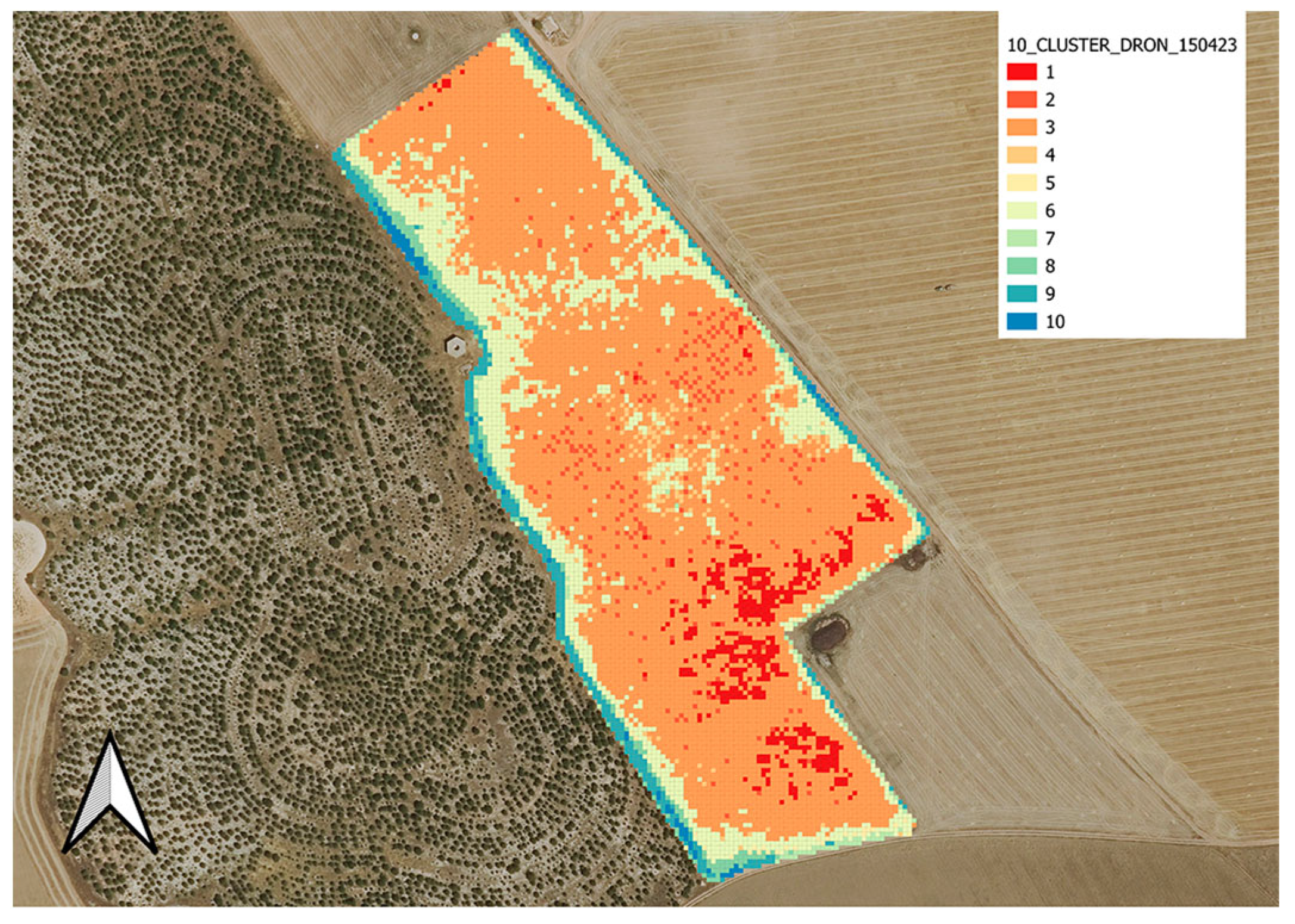Cluster segmentation was also a key component of the analysis, as it enabled the crop to be divided into homogeneous management zones according to the spectral behaviour of the trees. The 10-cluster classification was more efficient than the 5-cluster classification, as it avoided the overlap of extreme values and showed better differentiation of intermediate zones, which could be missed in a more general zoning system (