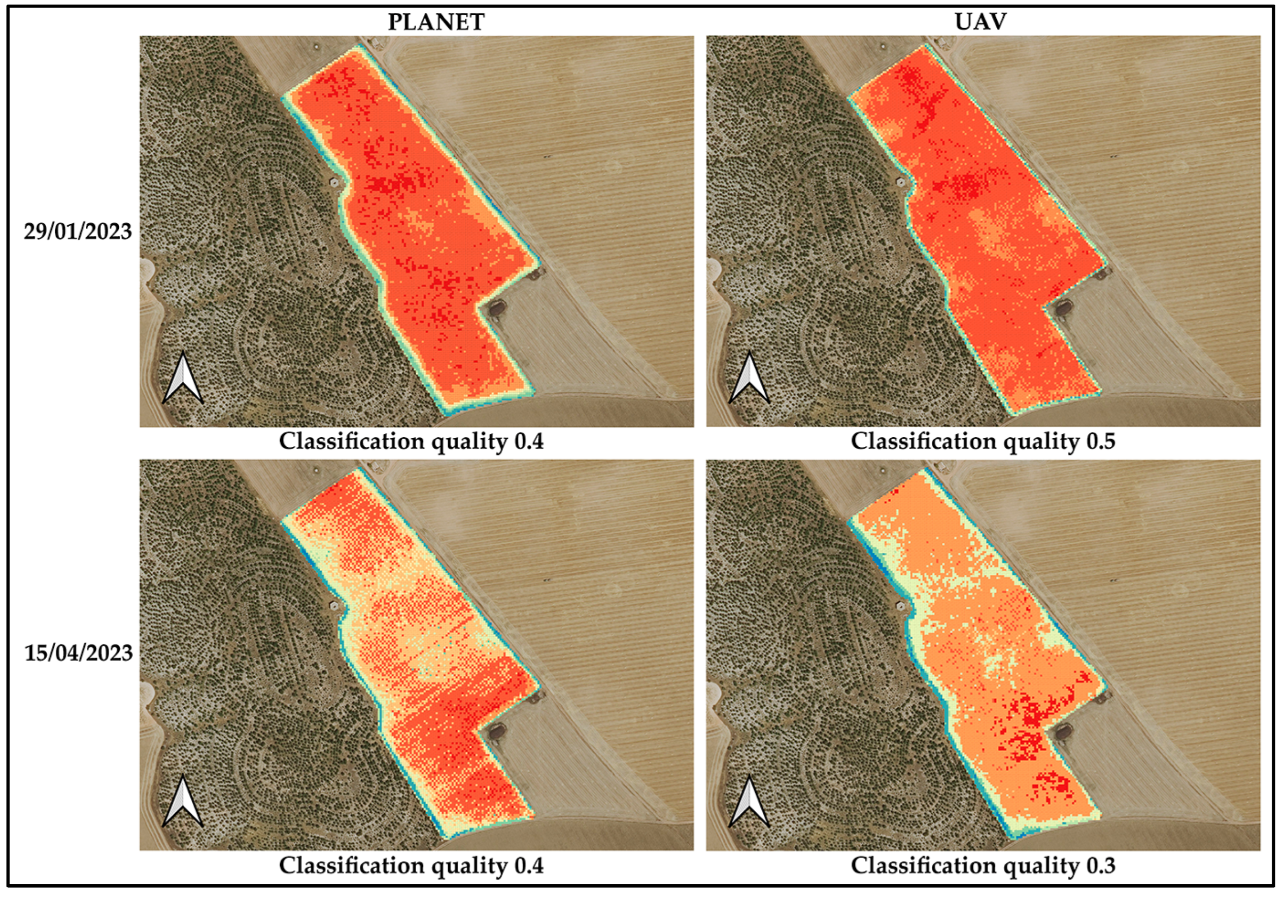 For the January images, the olive tree canopies were relatively homogeneous, which was reflected by both sensors, clearly showing the zones segmented by clusters. However, in the April images, a greater variability in the condition of the olive trees was observed, coinciding with the phenological stage of the crop during which buds appear that will later develop into flowers or new shoots. In this case, although the areas identified were the same for both sensors, the drone showed a higher resolution, which made it possible to locate the problem areas with greater precision, as shown in