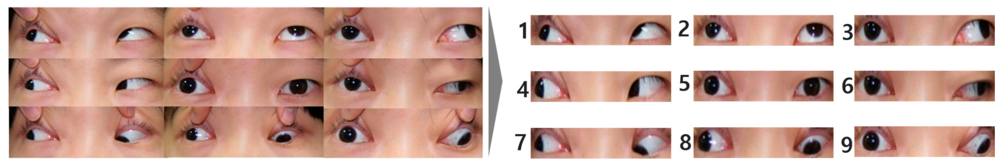 - Kang, Y.C.; Yang, H.K.; Kim, Y.J.; Hwang, J.; Kim, K.G. Automated Mathematical Algorithm for Quantitative Measurement of Strabismus Based on Photographs of Nine Cardinal Gaze Positions. Biomed. Res. Int. 2022, 24, 9840494. [Google Scholar] [CrossRef]