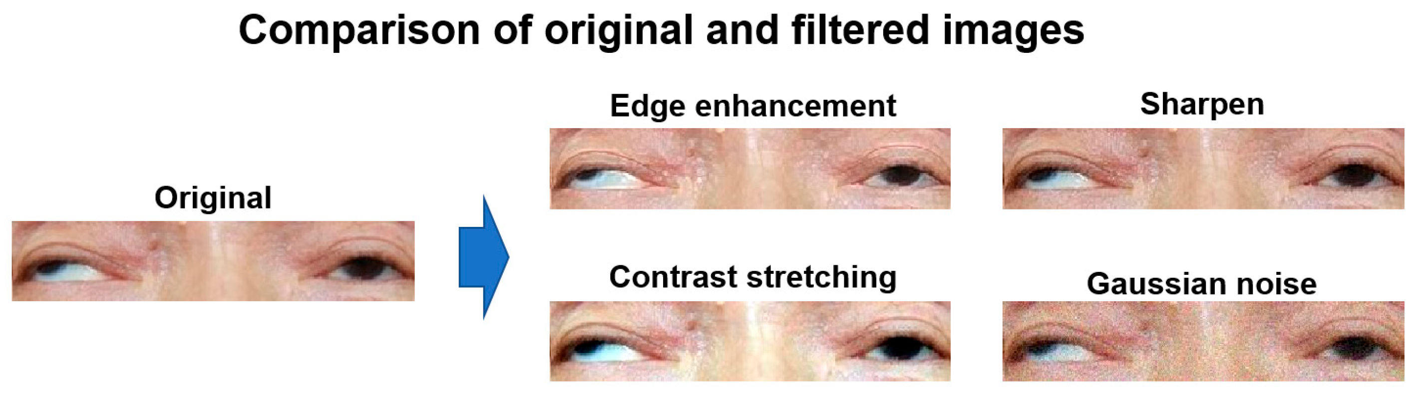 - Yarkheir, M.; Sadeghi, M.; Azarnoush, H.; Akbari, M.R.; Pour, E.K. Automated strabismus detection and classification using deep learning analysis of facial images. Sci. Rep. 2025, 15, 3910. [Google Scholar] [CrossRef]