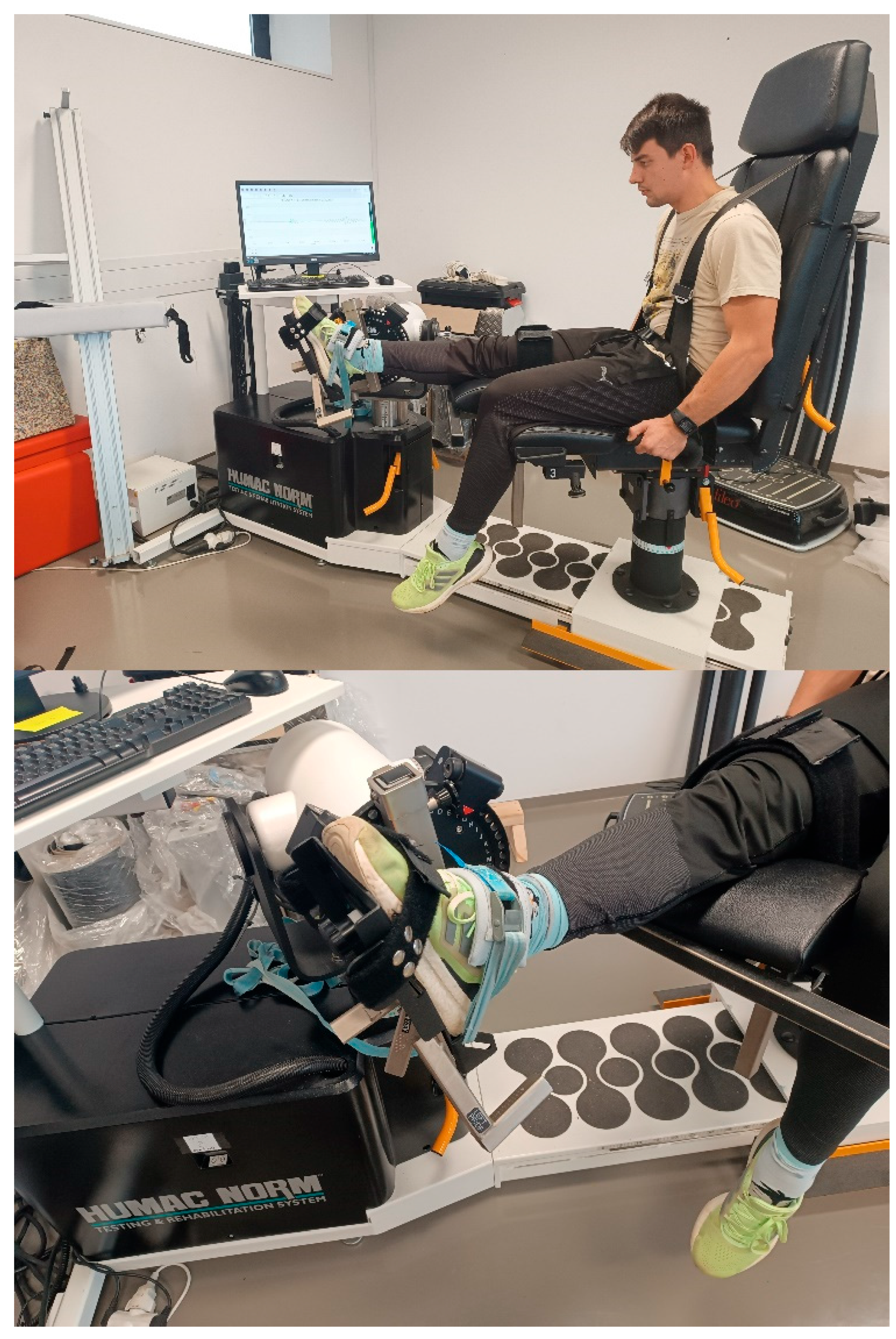 Figure 1), while the knee was planted and slightly flexed (i.e., approximately 10–15°, in order to reduce any negative effects of a potentially uncomfortable position that might affect the results). Both the ankle rotation axis and the foot support axis were at the same level. We strapped the participants across the shoulders, pelvis, and distal part of the femur of the measured limb. The fixations were refined through pilot testing, with the aim of minimizing the activation of the knee extensors and flexors, and the gluteal muscles. Participants were wearing sports shoes during the protocol.