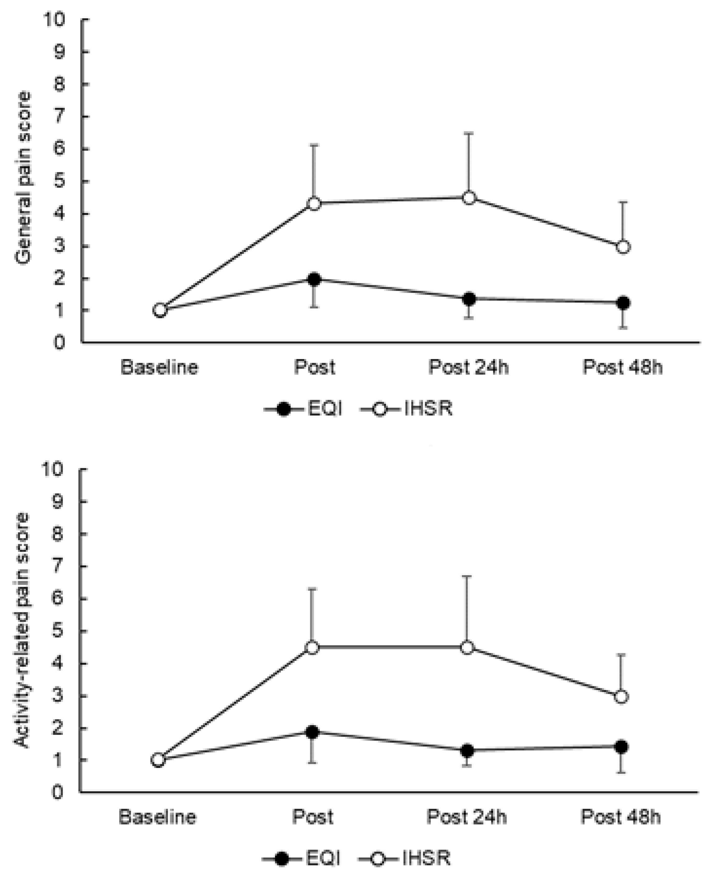 The IHSR protocol resulted in higher pain (considered as a marker of delayed onset muscle soreness [DOMS] at post24 and post48) compared to the EQI protocol at all time points (immediately post-protocol, 24 h post-protocol, and 48 h post-protocol). While the EQI group experienced the highest level of pain immediately post-protocol (2.00-points on a 10-point scale), the subjects in the other group experienced the highest level of DOMS 24 h after the protocol (4.50-points on a 10-point scale). The higher DOMS after the IHSR protocol could be due to the different characteristics between the two contractions, which are as follows: (1) performing eccentric contraction at much higher angular velocities results in higher DOMS levels [