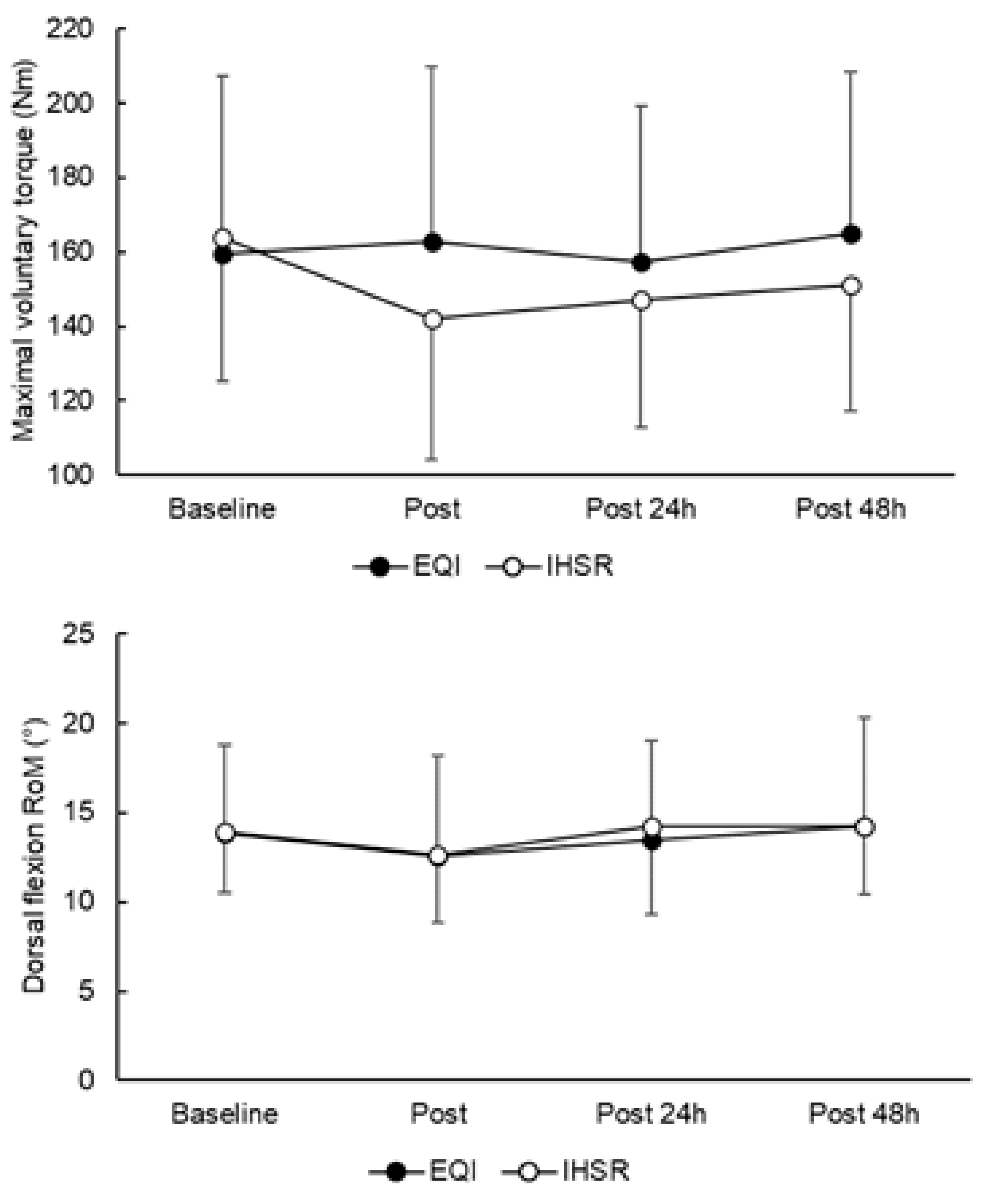 The study showed that the execution of neither the EQI nor IHSR protocol caused statistically significant differences in ankle RoM. Only a statistically significant difference was observed between measurements performed immediately after the execution of either one of the protocols and at a 48 h follow-up. As the decrease in RoM is associated with DOMS [