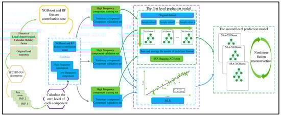ICEEMDAN-Bagging-XGBoost-MLR double-layer peak load forecasting model framework.