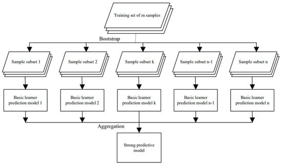 Bagging is an ensemble learning technique designed to effectively reduce variance. As shown in Figure 3, the algorithm’s architecture follows a self-sampling method (Bootstrap) to generate multiple random datasets. For instance, given a dataset D with m samples, random sampling with replacement is applied to produce a new dataset containing the same number of samples as the original dataset, performed m times. This process results in duplicate samples within the new dataset due to the random sampling. After completing n iterations of this self-sampling process, n new datasets are obtained. Each dataset is used to train n independent base learners . In regression tasks, the outputs from the trained base learners are averaged to compute the final result.