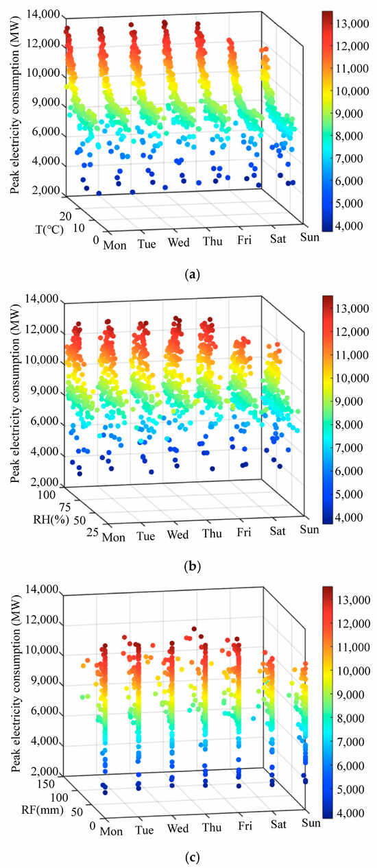 According to Figure 4, the maximum daily electricity consumption in this area gradually increases every year, and the daily peak load pattern is an inverted U shape. This is because in the modern power system, there are many types of electrical appliances that constitute the power load, and the proportion of loads affected by weather conditions such as air conditioners continues to increase, which increases the volatility and randomness of load changes. Figure 5 shows the spatial distribution of daily peak loads and their respective meteorological factors in this region.