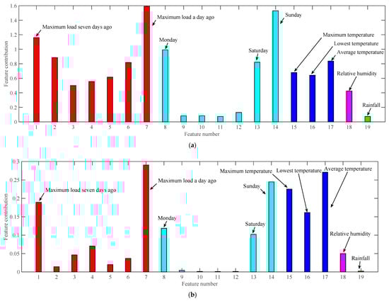 As shown in Figure 5, the load patterns on Saturdays and Sundays differ significantly from those observed on weekdays (Monday to Friday). Additionally, the daily maximum electricity consumption is strongly influenced by temperature fluctuations. Among the meteorological factors, although the effect of relative humidity on maximum power consumption is less pronounced than that of temperature, there is a discernible trend: as relative humidity increases, the daily maximum power consumption also tends to rise. Although rainfall is relatively frequent in this region, it has no significant impact on the maximum daily electricity consumption. Figure 6 presents the analysis of input feature contributions.