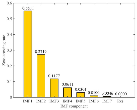 Figure 7 presents the decomposition results of ICEEMDAN applied to the daily peak load sequence. The zero-crossing rate of each IMF component obtained through ICEEMDAN decomposition is calculated, as shown in Figure 8. Based on the zero-crossing rates of the IMF components, high-frequency and stationary components are classified. Specifically, IMF1 to IMF3 are combined to form a new high-frequency component, IMF1′; IMF4 and IMF5 are combined into another high-frequency component, IMF2′; and IMF6 is included in a new high-frequency component, IMF2′. The remaining components are merged into a new stationary component, IMF3′. The high-frequency components, IMF1′ and IMF2′, are predicted using SSA-Bagging-XGBoost, while the stationary component, IMF3′, is predicted using MLR.