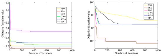 In this paper, the SSA is selected to optimize the hyperparameters of XGBoost. As shown in Figure 9, SSA demonstrates significant advantages in both convergence speed and global optimization capability. Experimental results indicate that SSA converges rapidly over multiple iterations and effectively avoids the issue of local optima, making it particularly effective for solving complex, high-dimensional, and multi-modal optimization problems. Compared to PSO, SSA is able to escape local optima during later iterations, ensuring a more thorough exploration of the global optimum. In comparison to GWO and WOA, SSA exhibits faster convergence and greater stability in multi-objective optimization problems. Moreover, when compared to MFO, SSA shows superior search efficiency and global optimization capability. In conclusion, the use of SSA for hyperparameter tuning of XGBoost in this study can significantly enhance the model’s predictive performance.