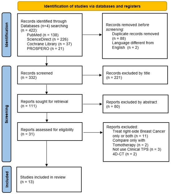 This systematic review was performed according to the Preferred Reporting Items for Systematic reviews and Meta-Analyses (PRISMA) 2020 guidelines [25], and adhered to a pre-registered protocol in PROSPERO (registration number: CRD420251168901). The records were searched in the last 13 years from PubMed, ScienceDirect, Cochrane Library and PROSPERO until 31 July 2025. The search strategy was developed iteratively to achieve an optimal balance between sensitivity and specificity, combining terms related to dosimetry and early-stage breast cancer. Exclusion criteria were applied to restrict the results to photon-based, linear accelerator techniques. This approach ensured comprehensive coverage of relevant comparative dosimetric studies while maintaining a clear and reproducible methodology. This methodology allowed to collect and analyse numerous publications related to the topic. These databases were chosen since they include all high impact journals in radiotherapy planning.