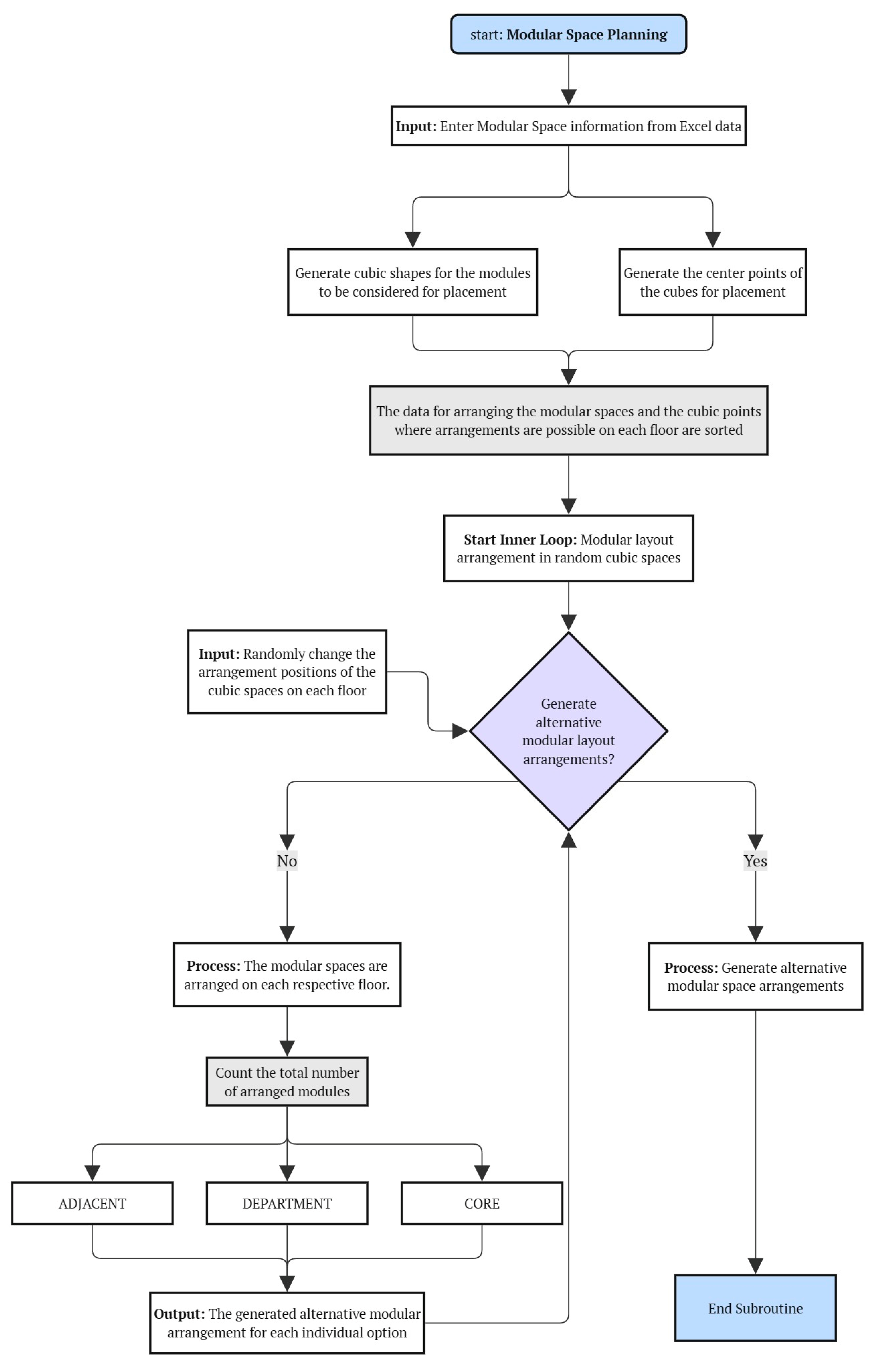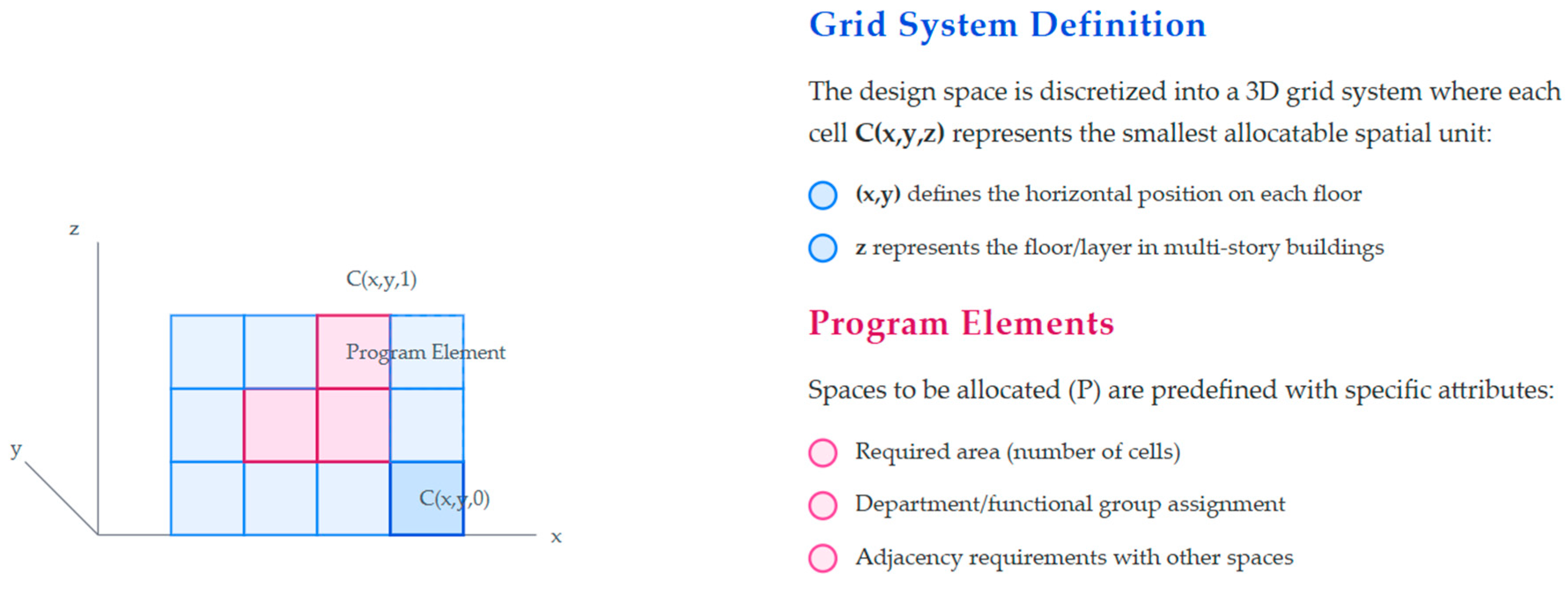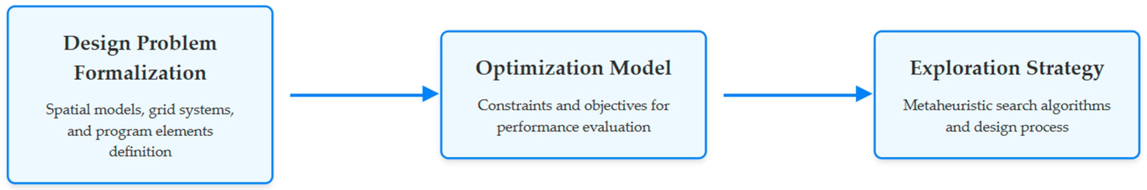 27]. The primary objective was to optimize spatial layout efficiency while satisfying the complex geometric constraints and functional requirements of multistory buildings. This methodology involves computationally defining the design problem (