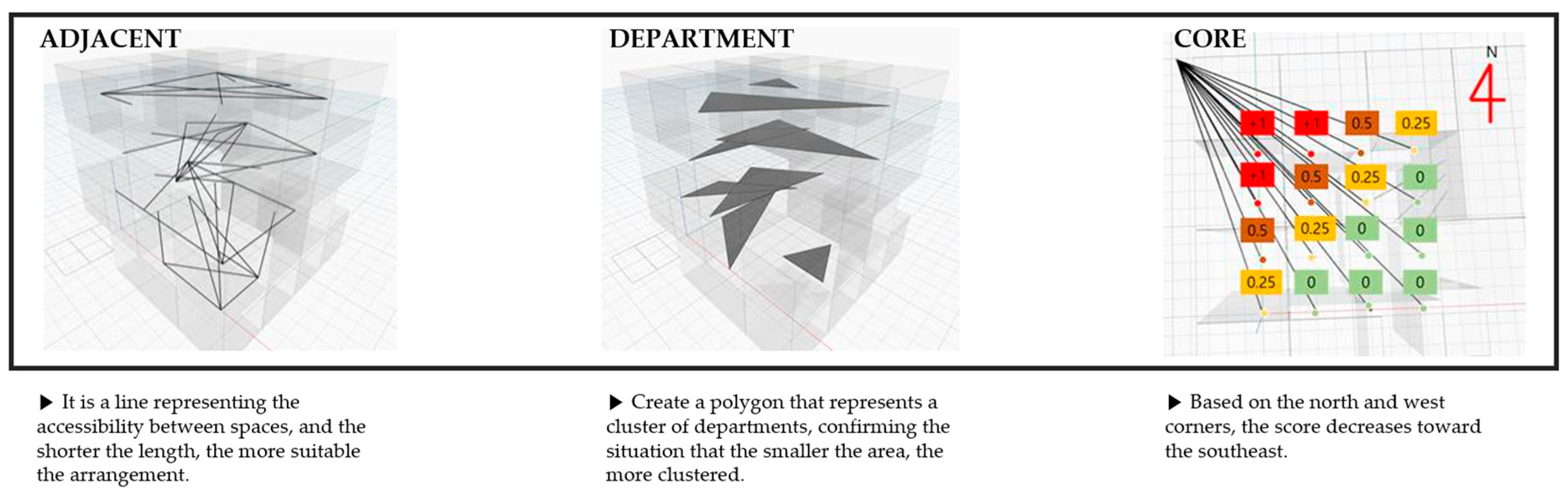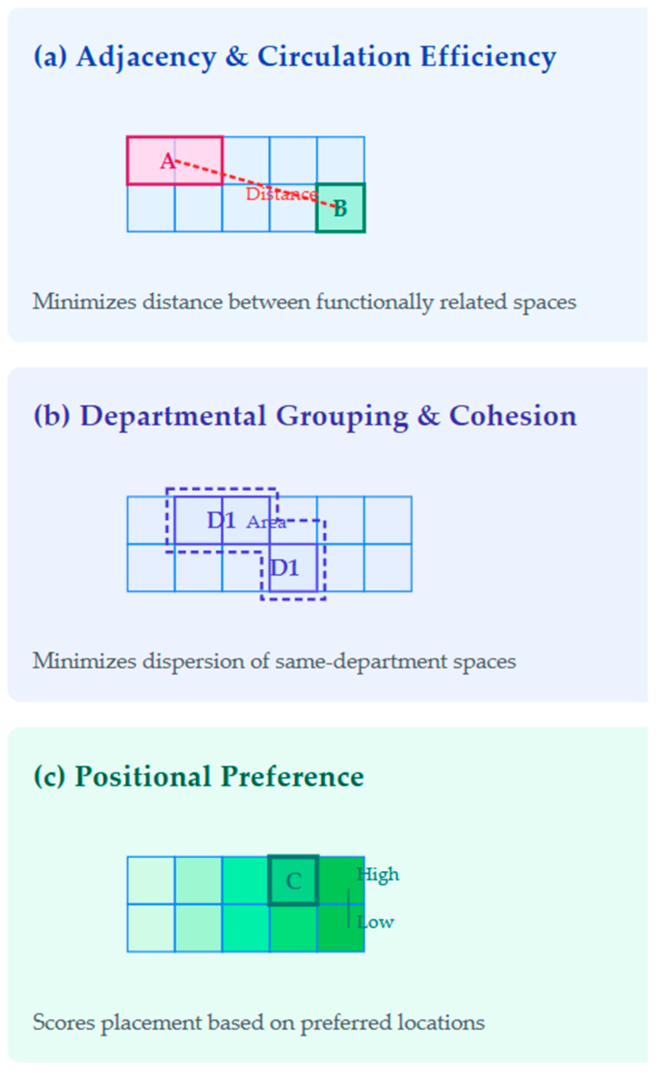 Soft objectives are quantitative indicators for evaluating the design quality. This study defined three key metrics related to the functional efficiency of spatial layouts. These metrics—adjacency, cohesion (compactness), and positional preference—are standard evaluation criteria widely adopted in architectural layout optimization research [