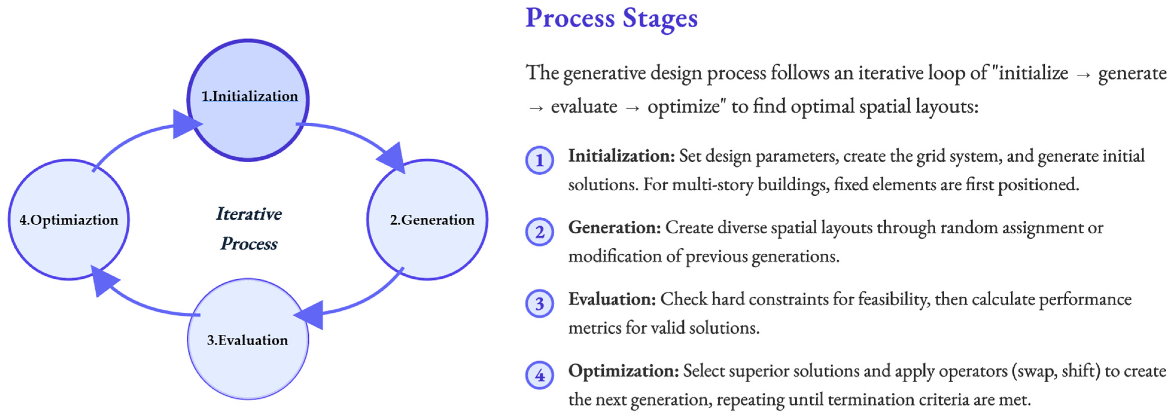 Following the initialization, the system enters the core loop of generation and evaluation. In the generation stage, diverse spatial layout alternatives are created either randomly or by modifying the superior solutions from the previous generation. Each generated alternative proceeds to the evaluation stage, where its feasibility is checked by verifying its compliance with the hard constraints. Only the feasible alternatives that pass this check proceed to calculation of soft objective metrics and quantitative evaluation of their performances.