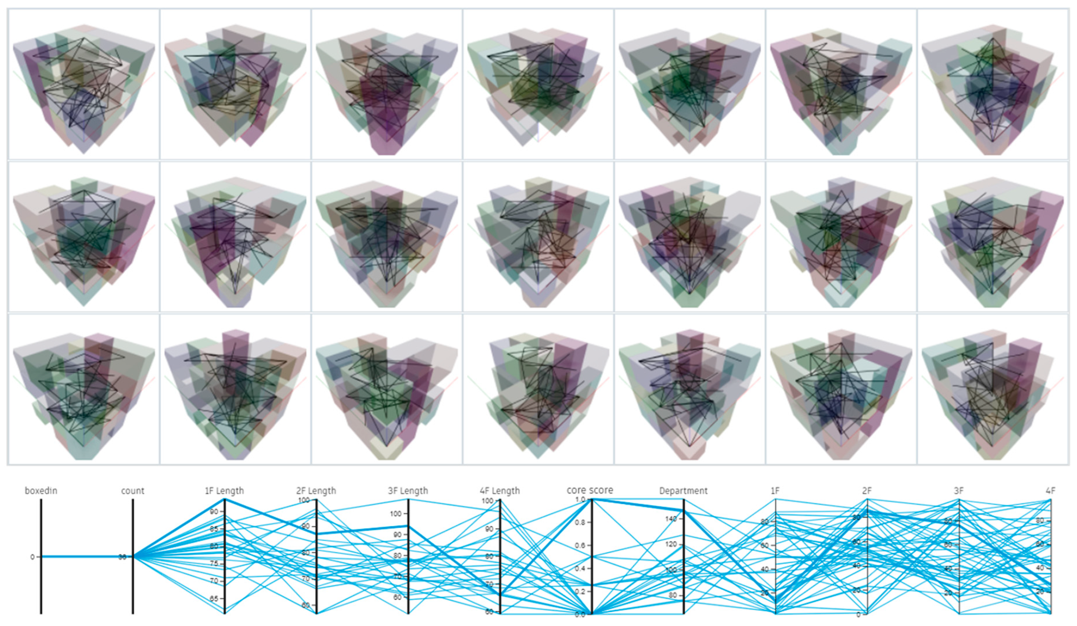 Furthermore, to evaluate the functional efficiency of the space, we established a multi-objective optimization framework by (3) defining adjacency (ADJACENT, minimizing circulation length), departmental grouping (DEPARTMENT, minimizing group area), and core position (CORE, optimizing location) as quantitative metrics, and simultaneously optimizing them. In conclusion, this study presents an integrated workflow that successfully implements and validates a procedure for automatically generating alternatives that optimize these three soft objectives while satisfying all hard constraints in a multistory scenario (four-story scale).
