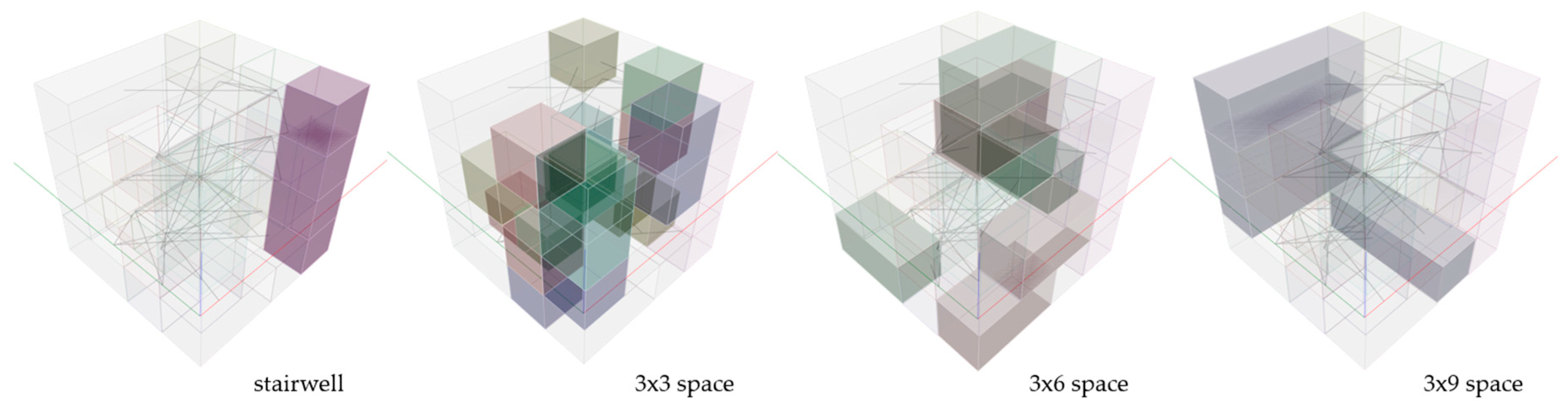 To define the SAP in multistory buildings, spaces must be classified according to their vertical mobility, and the characteristics of each type must be reflected as constraints. Accordingly, the spaces can be divided into two main types. The first type comprises fixed elements, such as stairwells or elevator cores, which require mandatory vertical continuity across all floors. These elements are strongly constrained in that they must maintain the same horizontal position (x,y) on each floor. The second type consists of flexible elements that refer to general functional spaces. These spaces are allocated relatively freely within the remaining available area according to the design objectives after the positions of the fixed elements have been determined.