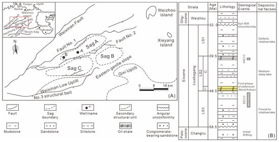 Location and composite stratigraphy of the study area. (A) Modified from Xu et al. (2021) [34]. (B) Modified from Huang et al. (2017) [35]. The vertical axis in the stratigraphic column is plotted against geological age (schematic, not to scale). It should be noted that the L–LS2 sedimentary period corresponds to the first phase of extension (the most active stage), and the climate was in transition from the end of the Early Eocene Climate Optimum (EECO) to a subsequent cooling period. “L” denotes the lower part of LS2, which is the studied interval; “U” denotes the upper part of LS2.
