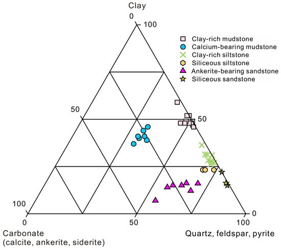 Mineral composition and organic matter characteristics are key factors in lithofacies classification. Thin-section observations and XRD analysis indicate that the rocks in the L–LS2 of the Weixi’nan Depression are primarily composed of quartz, clay minerals, and carbonate minerals. Ternary diagram analysis shows clustered mineral compositions (Figure 2). Total organic carbon (TOC) analysis reveals that clay-rich mudstone and calcium-bearing mudstone contain significantly higher organic matter than other lithofacies, while siliceous siltstone, ankerite-bearing sandstone, and siliceous sandstone are characterized by low TOC content (Table 1).