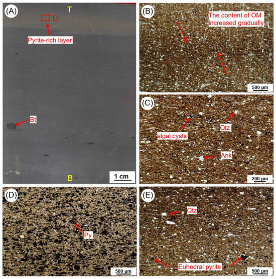Photographs of clay-rich mudstone lithofacies from Well A. (A) Homogeneous rocks with pyrite-rich layer and bitumen. 3022.57–3022.67 m. (B) Layered structure caused by varying organic matter content, single layers greater than 1 mm and less than 2 mm. 3025.60 m. (C) Clay-rich mudstone mainly consists of mud-sized clay minerals, silt-sized quartz, and ankerite. 3006.40 m. (D) Numerous granular pyrite in pyrite-rich layer. 3022.57 m. (E) Algae cyst body void filled with quartz and euhedral pyrite. 3021.25 m. T = top of the core segment; B = bottom of the core segment; Bt = Bitumen; Qtz = Quartz; Ank = Ankerite; Py = Pyrite.