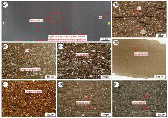 Thin-section analysis reveals that the clay minerals are intermingled with organic matter and distributed within the matrix. Bioclastic components, including ostracod shells (Figure 4D) that are 100 to 500 μm in size, are also notable, paralleling bedding planes and forming distinct layers with smooth, concave–convex contacts (Figure 4D). SEM analysis reveals detailed pore structures associated with framboidal pyrite. Algal fragments are also present, typically arranged horizontally (Figure 4B,C,E,F). Localized bioturbation features are observed as reddish-brown lenticular structures, primarily filled with calcite (Figure 4E,G,H). This facies was deposited under weakly reducing to slightly oxic conditions, suggesting elevated lake salinity with intermittent oxidation events during sedimentation [11].