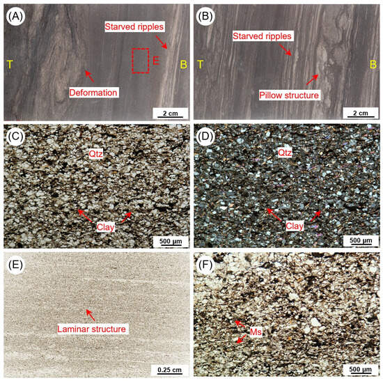 Photographs of clay-rich siltstone lithofacies from Well A. (A) Grey sandstone with deformation and starved ripples. 3027.81–3027.94 m. (B) Starved ripples and pillow structure. 3028.45–3028.58 m. (C) Fine-grained quartz and clay-rich layer. 3027.90 m. (D) Same as (C) under cross nicols. (E) Thin section of clay-rich siltstone showing faint laminae. 3027.90 m. (F) Fine-grained quartz and muscovite are the main terrigenous detrital materials. 3028.54 m. T = top of the core segment; B = bottom of the core segment; Qtz = Quartz; Ms = Muscovite.