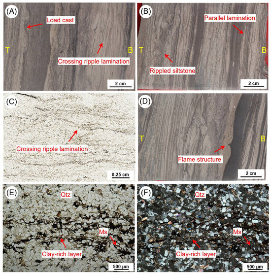 Photographs of siliceous siltstone lithofacies from Well A. (A) Siliceous siltstone with crossing ripple lamination. Load cast at the bottom of the siliceous siltstone. 3028.25–3028.36 m. (B) Siliceous siltstone with parallel bedding. 3028.66–3028.78 m. (C) Crossing ripple lamination at thin-section-scale. 3028.33 m. (D) Flame structure at its base. 3027.61–3027.73 m. (E) Quartz content is relatively high, while clay and muscovite are mainly found in clay-rich layers. 3028.33 m. (F) Same as (C) under cross nicols. T = top of the core segment; B = bottom of the core segment; Qtz = Quartz; Ms = Muscovite.