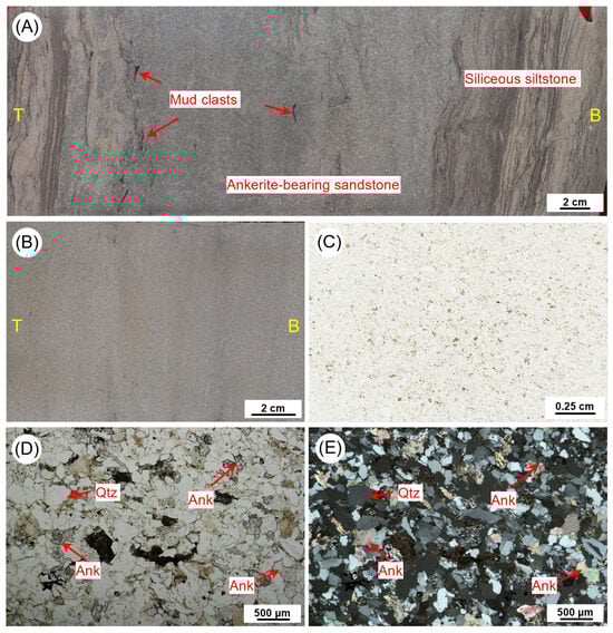 Photographs of ankerite-bearing sandstone lithofacies from Well A. (A) Massive ankerite-bearing sandstone with mud clasts. 3027.00–3027.15 m. (B) Light gray massive ankerite-bearing sandstone. 3027.30–3027.44 m. (C) Relatively homogeneous texture with good particle sorting at thin-section-scale. 3027.33 m. (D) Microscopic characteristics of ankerite-bearing sandstone. Ankerite is present as cement, filling the space between quartz grains. 3027.33 m. (E) Same as (C) under crossed polarized light to emphasize ankerite. T = top of the core segment; B = bottom of the core segment; Qtz = Quartz; Ank = Ankerite.
