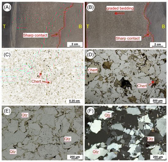Photographs of siliceous sandstone lithofacies from Well A. (A) The sharp contact in siliceous sandstone indicates multiple phases. 3026.86–3026.99 m. (B) Graded sandstone with a sharp basal contact with the underlying clay-rich siltstone. 3027.01–3027.14 m. (C) Siliceous sandstone is clean and high in quartz content (over 80%) by thin-section identification. 3026.98 m. (D) Microscopic characteristics of siliceous sandstone. 3026.98 m. (E) Quartz content is extremely high, while clay matrix content is very low. 3027.23 m. (F) Same as (D) under crossed polarized light. T = top of the core segment; B = bottom of the core segment; Qtz = Quartz.