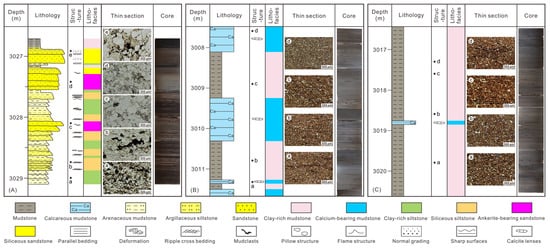 The L–LS2 of the Weixi’nan Depression exhibits a thickness ranging from 40 to 80 m, with the Sag A region potentially exceeding 100 m in thickness. This interval primarily consists of mudstone and a small amount of siltstone and sandstone. Mudstone displays typical high GR characteristics in well logs, indicating a high clay mineral content. The GR response of siltstone and sandstone is significantly lower than that of the adjacent high GR mudstone. Based on mineralogy, texture, structure, and biological features, six lithofacies can be identified: (1) clay-rich mudstone, (2) calcium-bearing mudstone, (3) clay-rich siltstone, (4) siliceous siltstone, (5) ankerite-bearing sandstone, and (6) siliceous sandstone.
