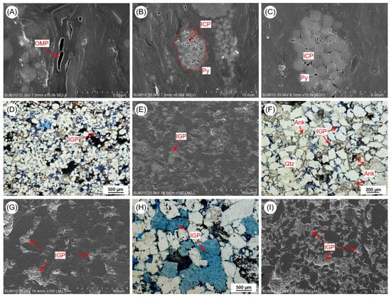Carbonate minerals are present in minor amounts, with locally developed euhedral ankerite crystals (Figure 3C). Pyrite is relatively abundant, occurring predominantly as granular or framboidal forms, and often forms nodular or stratified accumulations (Figure 3A,D). In addition, algal cyst structures are observed [11,44], which are commonly infilled with quartz, pyrite, and bitumen (Figure 3C,E). This lithofacies was typically deposited in a low-energy, stagnant water environment under strongly reducing conditions.
