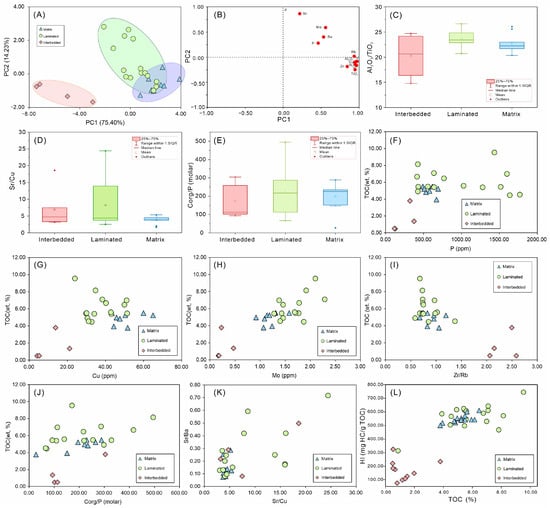 The ratio of organic carbon to phosphorus (Corg/P) reflects the redox conditions of the depositional environment [69]. In this study, Corg/P (molar) values range from 66.14 to 495.06. The interbedded lithofacies assemblage shows the lowest ratios (93.77–304.46), while the laminated lithofacies assemblage shows the widest variability (66.14–495.06). The matrix lithofacies assemblage generally exhibits high Corg/P ratios (145.84–288.85, Table 2).