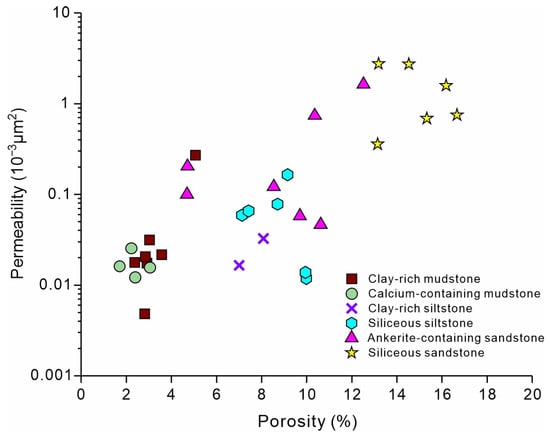Clay-rich mudstone develops limited organic matter pores and intercrystalline pores within pyrite (Figure 12A,B). This lithofacies is predominantly compact, with porosity ranging from 2.38% to 5.06% (average 3.23%) and mean permeability of 0.05 × 10−3 μm2, indicating poor reservoir potential. Calcium-bearing mudstone likewise exhibits few organic pores but well-developed pyrite intercrystalline pores (Figure 12C). Porosity ranges from 1.70% to 3.05% (average 2.34%), and permeability ranges from 0.01 × 10−3 μm2 to 0.03 × 10−3 μm2 (average 0.02 × 10−3 μm2), suggesting poor reservoir potential. Clay-rich siltstone has few pores, with porosity values between 6.89% and 8.58% (average 7.64%). Permeability ranges from 0.02 × 10−3 μm2 to 0.03 × 10−3 μm2 (average 0.025 × 10−3 μm2), indicating limited reservoir quality. In siliceous siltstone, sparse intergranular pores predominate (Figure 12D,E). Porosity ranges from 7.13% to 9.98% (average 8.72%), while permeability ranges from 0.01 × 10−3 μm2 to 0.08 × 10−3 μm2 (average 0.07 × 10−3 μm2), reflecting average reservoir potential. Ankerite-bearing sandstone is dominated by intergranular pores often occluded by carbonate cements (Figure 12F,G). Porosity ranges from 4.69% to 12.52% (average 8.64%), and permeability ranges from 0.05 × 10−3 μm2 to 1.64 × 10−3 μm2 (average 0.41 × 10−3 μm2), suggesting moderate reservoir potential. Siliceous sandstone has more developed porosity compared to ankerite-bearing sandstone (Figure 12H,I), with porosity ranging from 13.15% to 16.66% (average 14.84%). Permeability ranges from 0.36 × 10−3 μm2 to 2.75 × 10−3 μm2 (average 1.48 × 10−3 μm2), indicating favorable reservoir potential.
