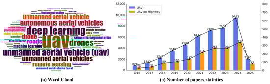 Analysis of UAV-related research trends. (a) Word cloud of keywords commonly found in UAV research literature. (b) Annual number of published papers retrieved from Web of Science (WoS) on UAV research and UAV applications specifically in highway systems from 2016 to 2025.