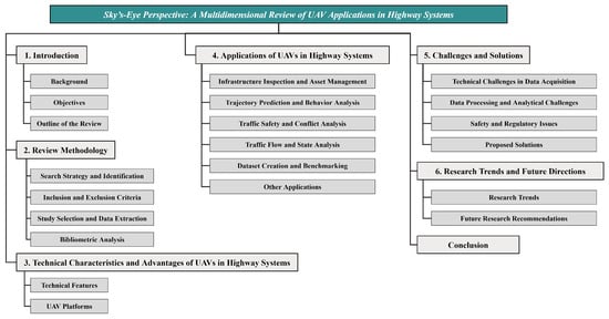 The review is structured as follows. Section 2 details the systematic review methodology (SLR) used for this study, including the search strategy, inclusion/exclusion criteria, and the study selection process. Section 3 discusses the technical characteristics and advantages of UAV technologies, focusing on a comparative analysis of sensor types, data acquisition features, and platform-specific considerations, which lay the foundation for future applications. Section 4 comprehensively and critically reviews the practical applications of UAVs in highway systems in multiple dimensions, including infrastructure inspection, trajectory prediction, traffic safety analysis, and traffic flow monitoring. Section 5 critically addresses the existing technical, regulatory, and ethical challenges related to the deployment of UAVs and proposes potential solutions. Section 6 explores research trends and future directions, highlighting integration strategies with emerging technologies, such as AI, 5G, and IoT, and provides recommendations for future research paths. Finally, Section 7 concludes the review by summarizing the key findings, reiterating the contributions of the article, and highlighting the potential and necessity of UAV technology while providing strategic research recommendations. The general structure of this review is organized into seven main sections, as shown in Figure 2.