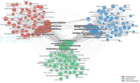 The resulting keyword co-occurrence network is illustrated in Figure 4. The network map reveals three distinct and influential research clusters, distinguished by color. The first cluster (red) is centered on methodologies, dominated by keywords such as ‘deep learning’, ‘computer vision’, ‘object detection’, and ‘trajectory extraction’. This signifies a strong focus on advanced data-processing techniques as a foundational element of the research. The second cluster (green) represents the primary application domains, connecting keywords like ‘traffic monitoring’, ‘safety analysis’, ‘trajectory prediction’, and ‘conflict analysis’. The third, and final, cluster (blue) highlights the growing research trend in asset management, linking keywords such as ‘infrastructure inspection’, ‘bridge inspection’, ‘pavement’, and ‘damage detection’. The density of this network underscores the interdisciplinary nature of the field, where methodological advances are directly fueling a diverse range of highway-monitoring applications.