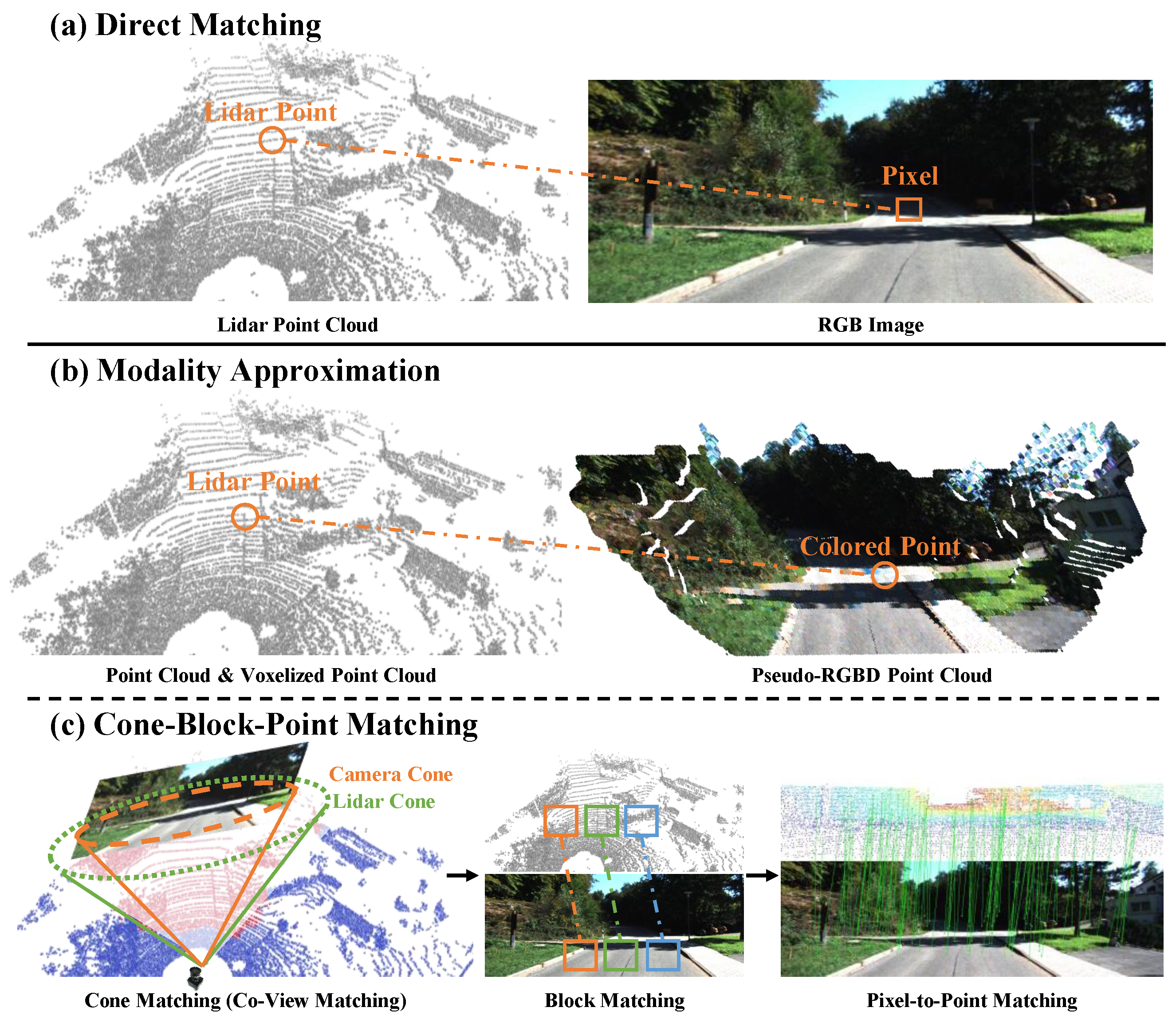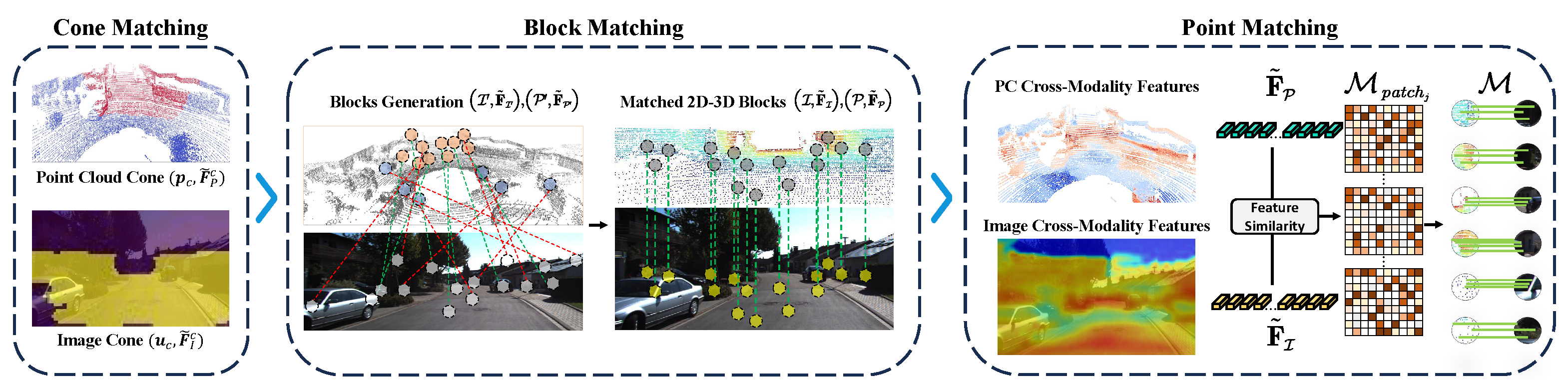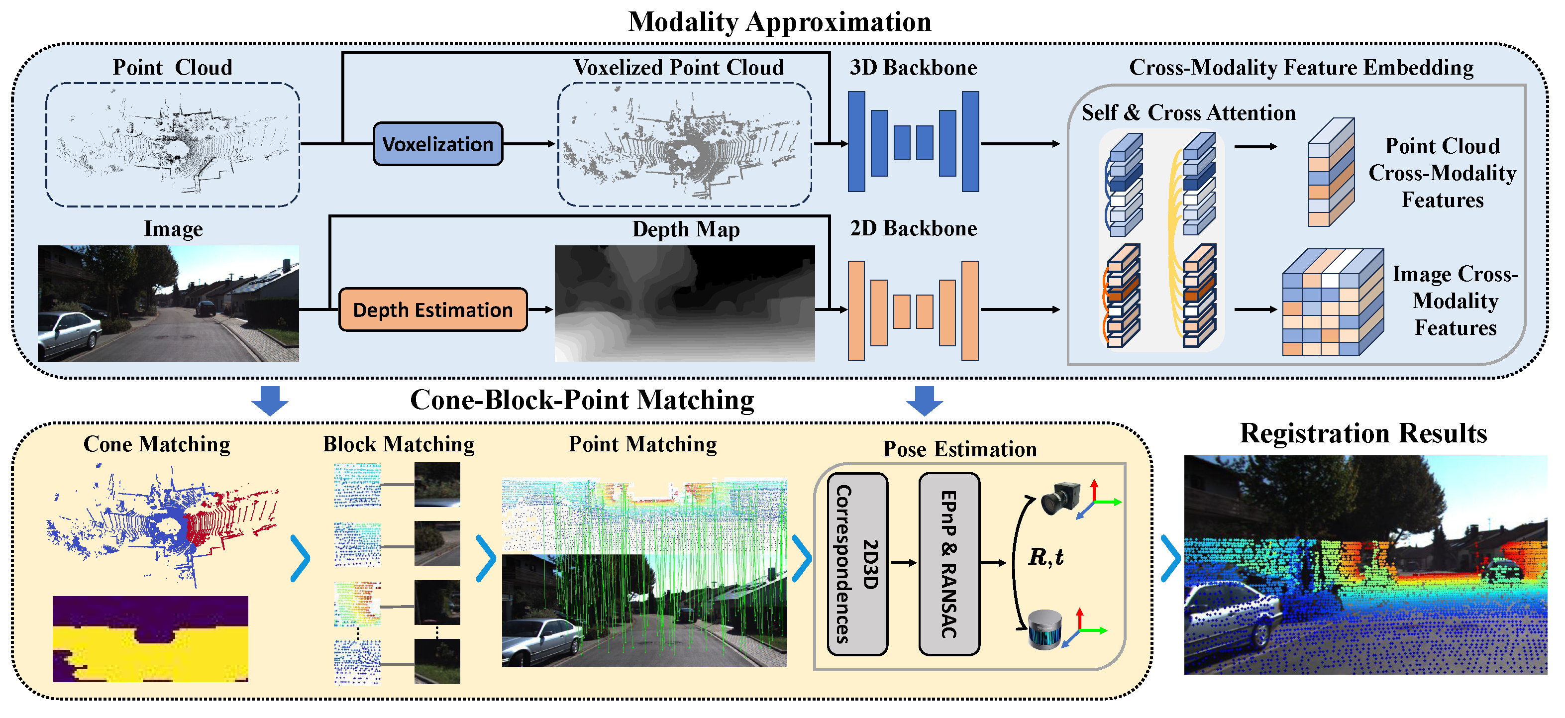 approximation–fusion–matching” architecture. It is composed of a modality approximation module and a cone–block–point matching strategy. The former utilizes image depth estimation and point cloud voxelization to align images and point clouds in terms of geometric structure and feature representation, respectively. Also, it adopts cross-modal feature embedding to enhance feature repeatability. The latter cone–block–point matching establishes pixel-to-point correspondences by leveraging aligned cross-modality features.