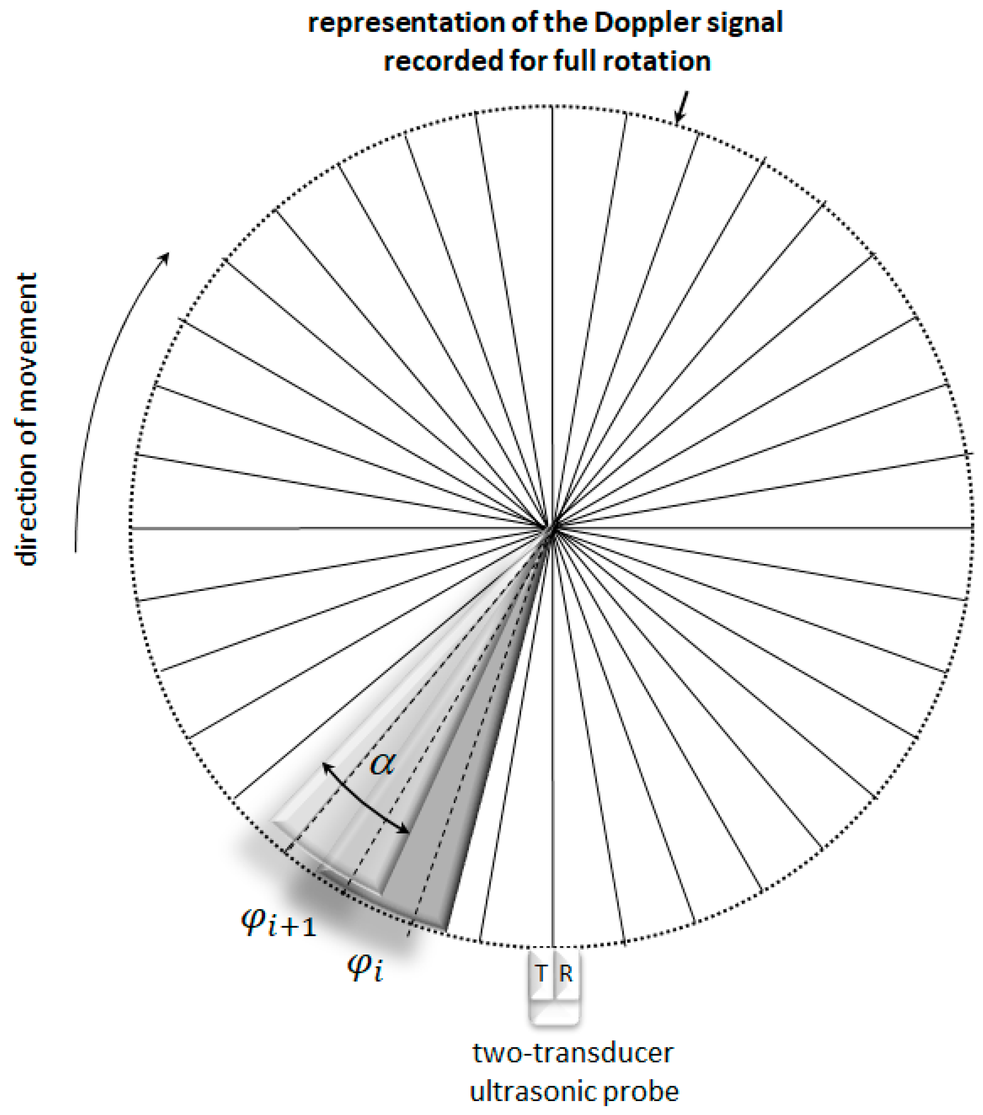 The circle in Figure 5 represents the recorded Doppler signal from a complete rotation of the test object (or probe). This circle has been divided into equal slices. Each slice represents one rotation angle φ (measurement projection). As already mentioned, for image reconstruction using the DT method, it is necessary to determine the Doppler signal spectra for each angle. However, for such a simple division of the signal (without angular overlapping), the resolution of the Doppler spectrum Δfd is too small: