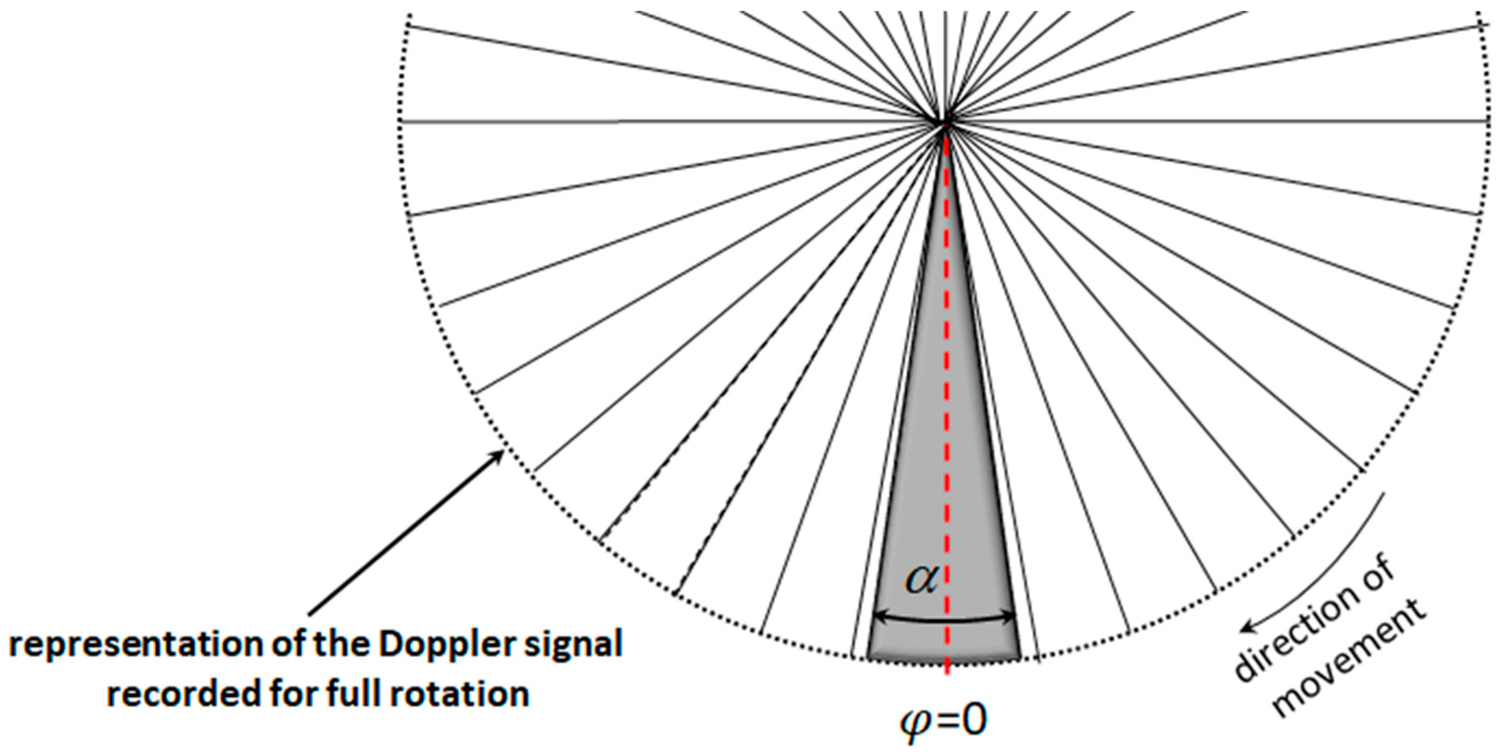 The parameter α (Figure 5) is responsible for the length of the Doppler signal for the angles of rotation φ (time window). For simplicity, it was assumed that it would be expressed in angular measure, i.e., it would be the width of the angle relative to a complete rotation (360°). It should also be specified here that the middle value in the width range α was taken as the representation of the rotation angle φ, as shown in the example of angle φ = 0 in Figure 6. Additionally, it should be noted that a standard rectangular window was used to determine the time window with a length of α.