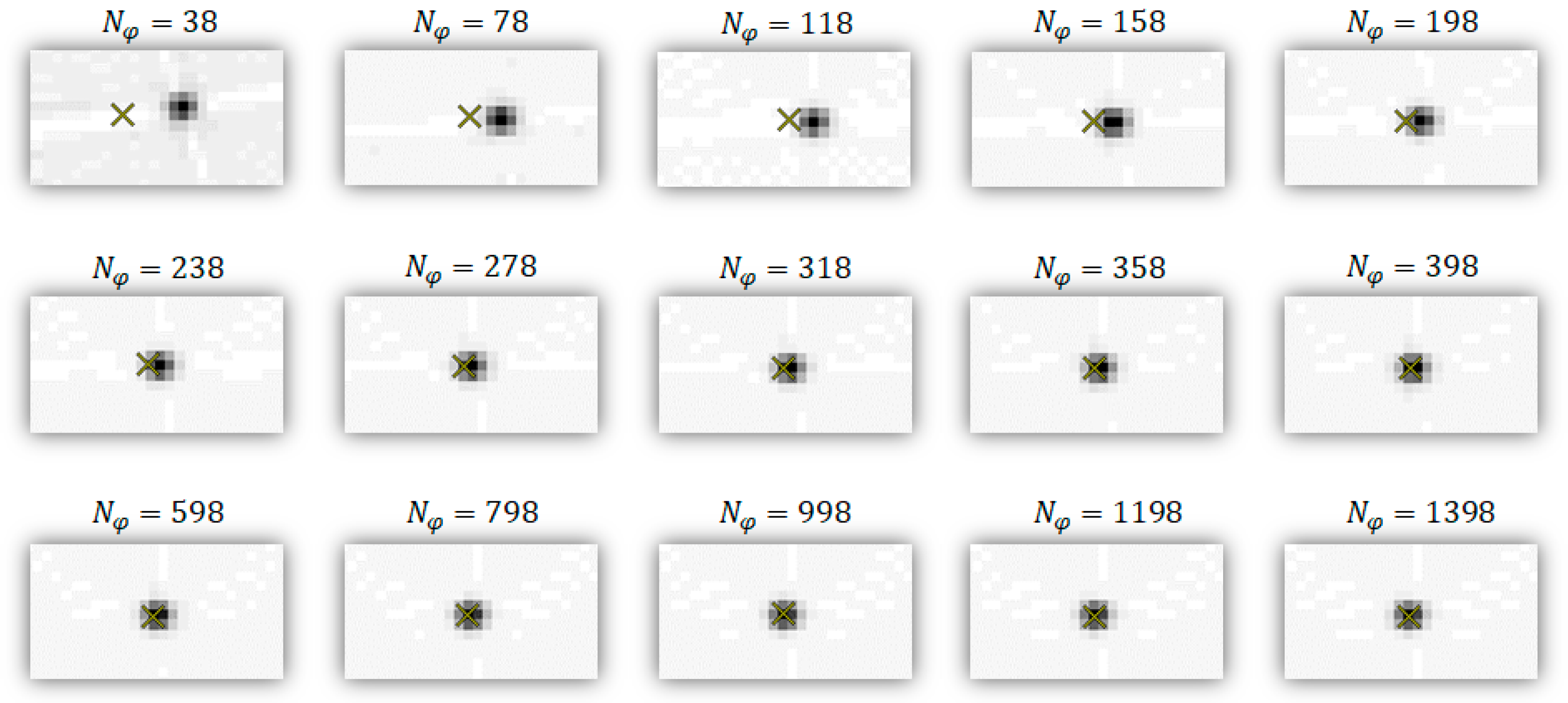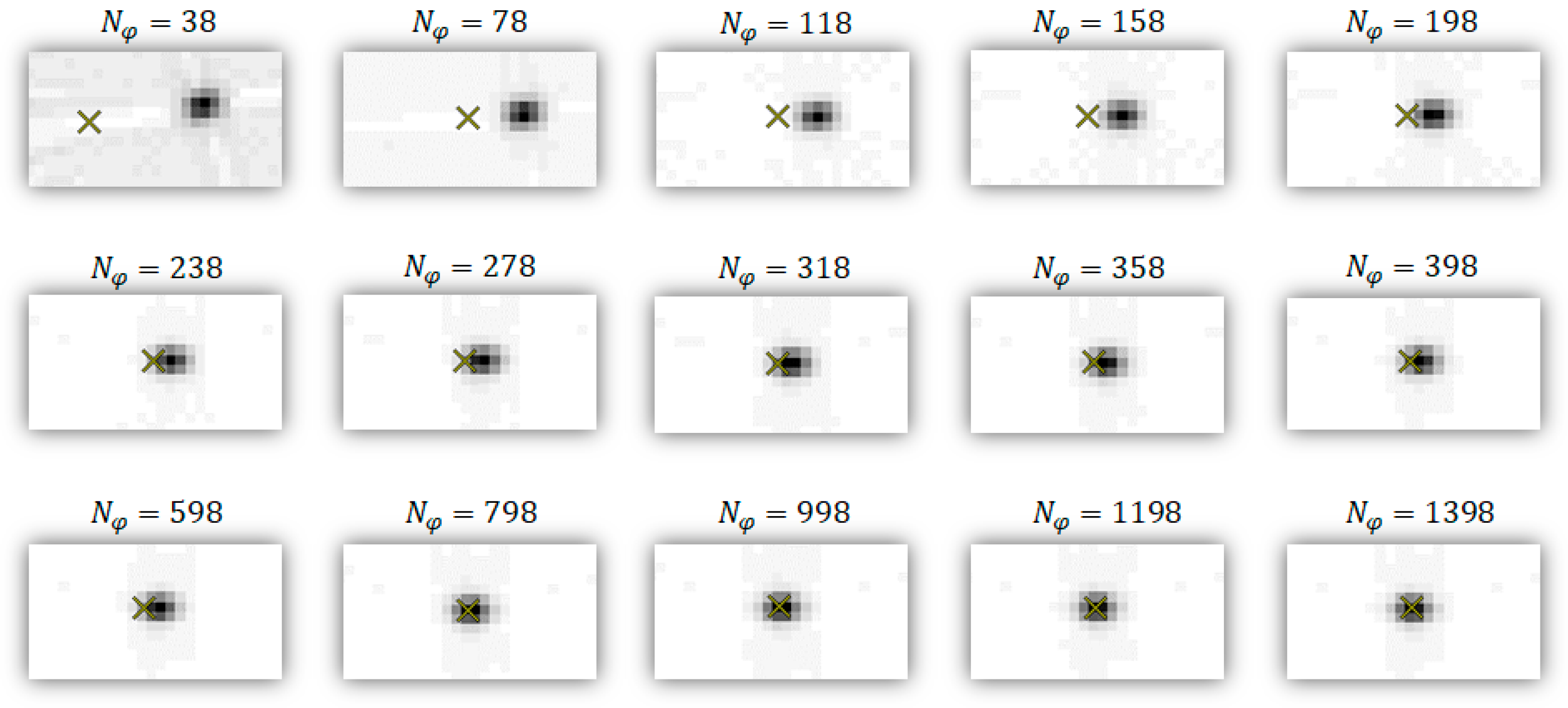 In Figure 8, the symbol “x” marks the position where the center of the inclusion image should be reconstructed. As can be seen, for such a small value of the Nφ parameter, a significant shift error appeared in the inclusion image. A comparative analysis for different values of Nφ was performed on sections of the 18 mm × 34 mm ROI (region of interest) image near the scatterer image (Figure 8 and Figure 9). Successive DT images of inclusion positioned 2.5 cm from the center of rotation were reconstructed for Nφ = 78, 118, 158, 198, 238, 278, 318, 358, 398, 598, 798, 998, 1198, and 1398. The results of these reconstructions for the ROI area specified above are compared in Figure 9, marking the correct position of the inclusion in each image with an “x”.