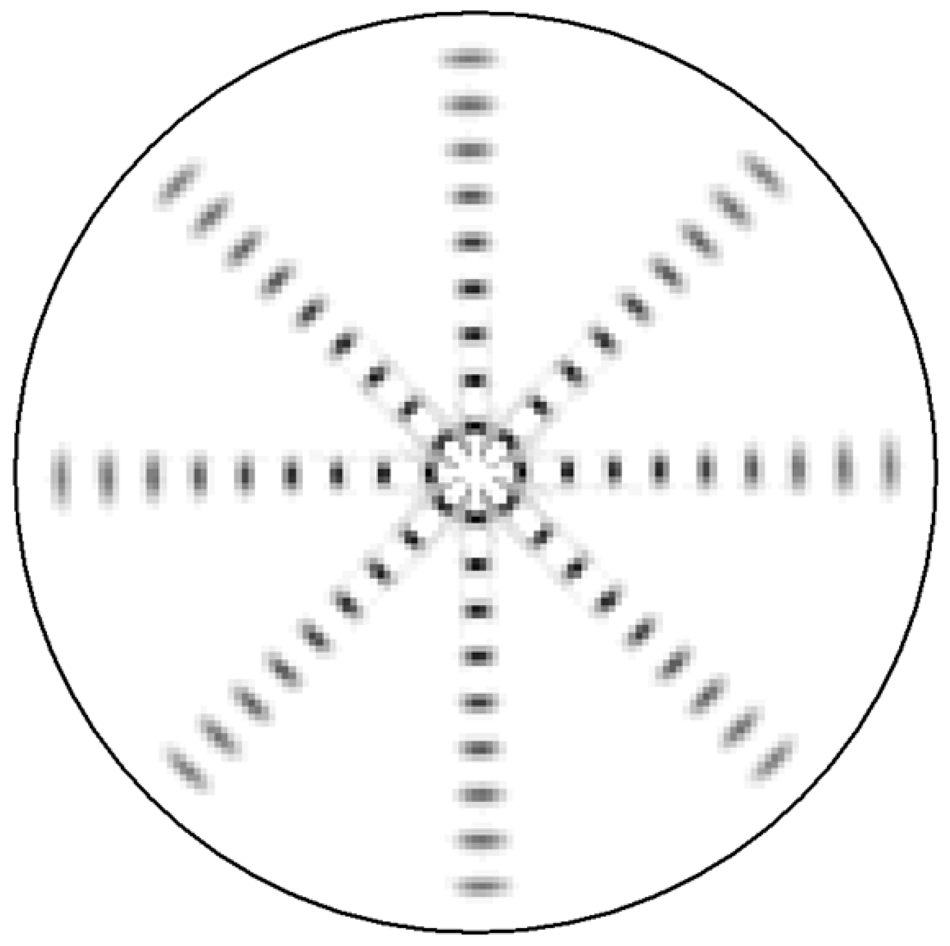 First, images were reconstructed for a large parameter value of α = 14.4°. Images of inclusions positioned at different distances from the center of rotation and at the same angles were reconstructed, as shown in Figure 7a, except that the inclusions were positioned every 5 mm from the center of rotation, the number of angles was increased (0°, 45°, 90°, 135°, 180°, 225°, 270°, 315°), and the number of inclusions was increased to 72. The previously determined optimal value of Nφ = 798 was used in the simulation. The results of this simulation are shown in Figure 13. To increase the dynamic range of imaging of the individual inclusions in relation to the surrounding background, the grey image background in Figure 13 was changed to white. It can clearly be seen that the shape images of the inclusions get longer as they move away from the center of rotation. This effect is undesirable as it falsifies the size and shape of the objects. It is, therefore, necessary to investigate whether it is possible to minimize these distortions by selecting a suitable, optimal value for the parameter α. It should also be noted that the greatest distortions occur for the inclusions furthest from the center of the imaging zone (center of rotation).