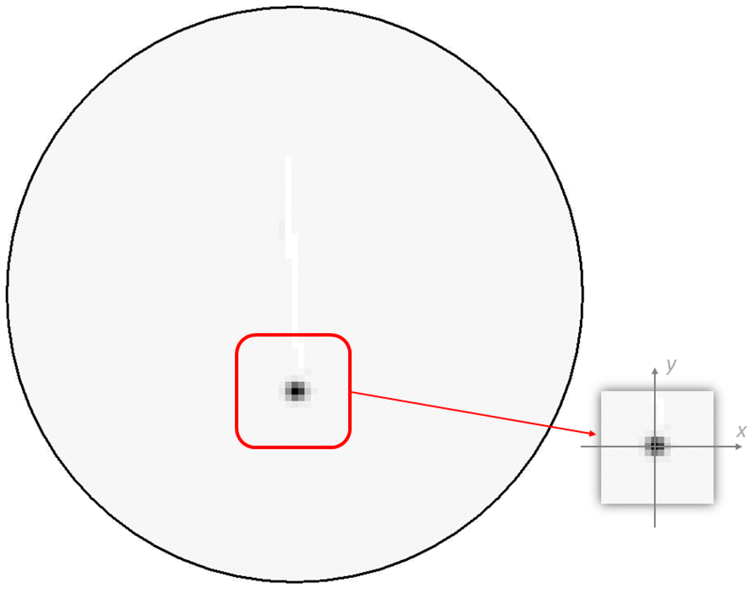Figure 14. Reconstruction of the image of an inclusion placed at a distance of 2.5 cm from the center of rotation, at an angle of 0° to the ultrasound probe, for a parameter α = 5.4°.