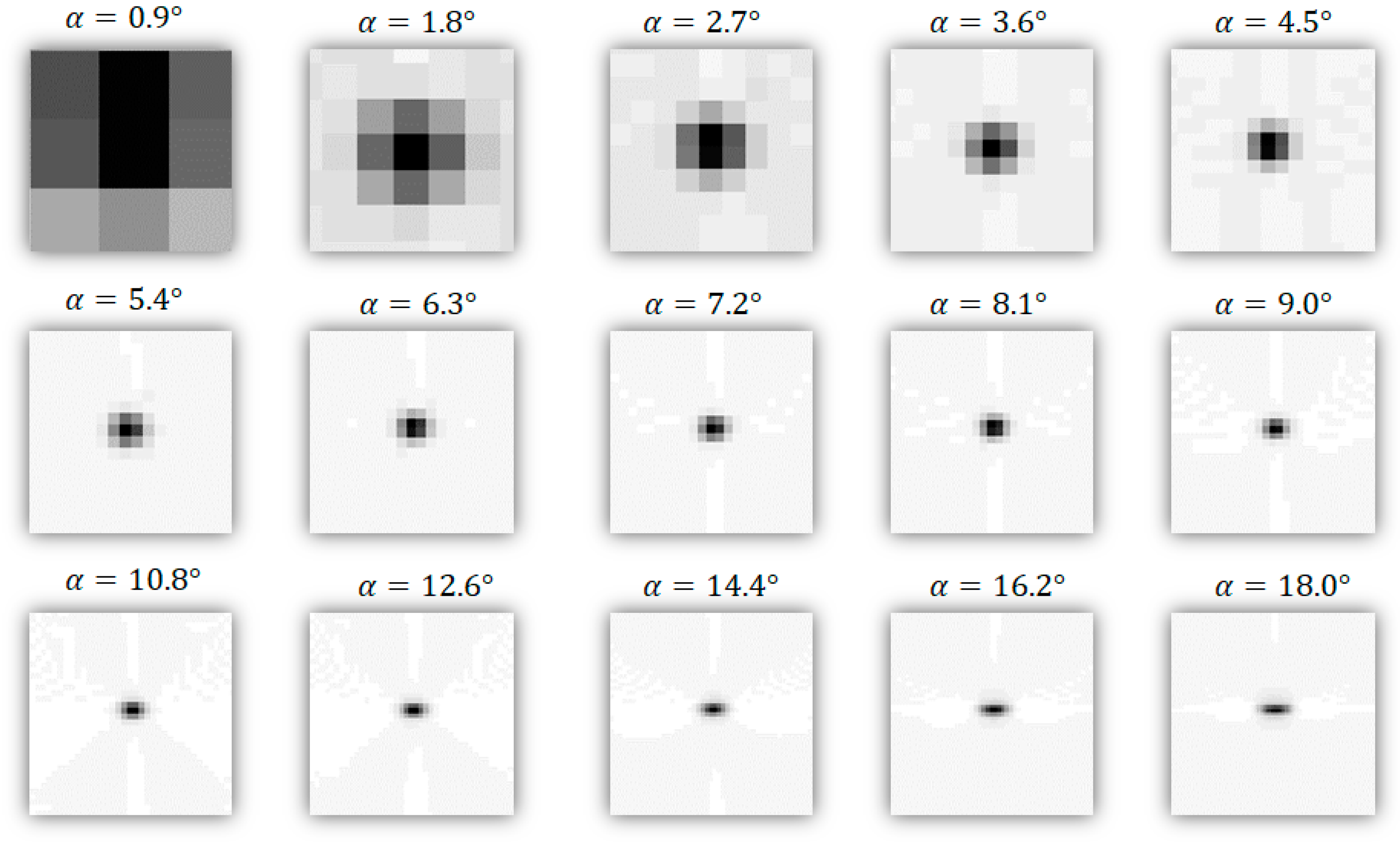 Figure 15. Reconstructed images of an inclusion placed on a rotating platform at a distance of 2.5 cm from the centre of rotation, at an angle of 0° to the ultrasound probe, for parameter α = 0.9°, 1.8°, 2.7°, 3.6°, 4.5°, 5.4°, 6.3°, 7.2°, 8.1°, 9.0°, 10.8°, 12.6°, 14.4°, 16.2°, and 18.0°.