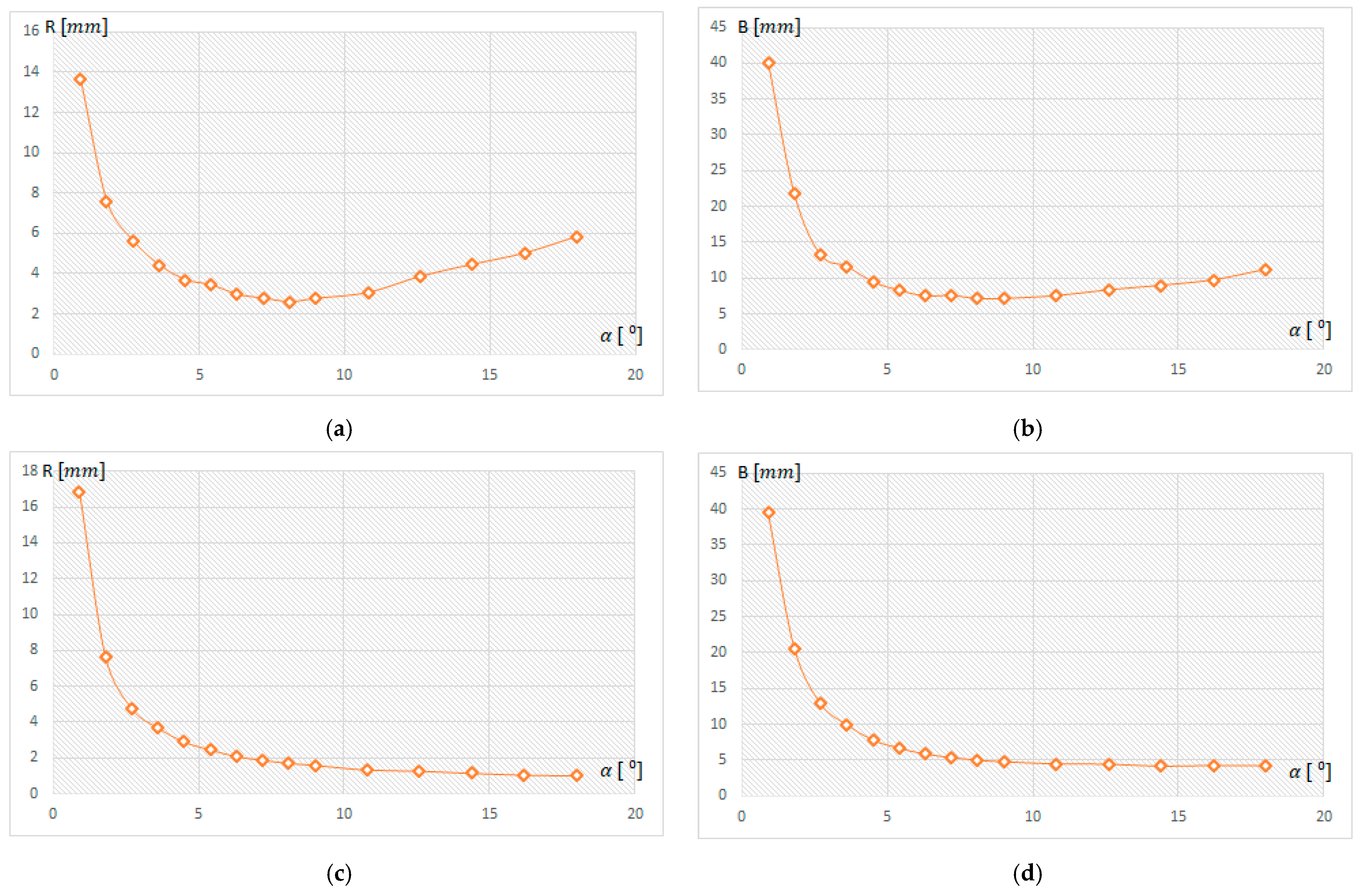 As can be seen, in most cases, the resolution and blurring of the inclusion image improve exponentially as the parameter α increases. The exception is the resolution along the inclusion image shown in Figure 17a. There, a deterioration in resolution can be seen for values of α > 9°. This is confirmed by the earlier observations of the images in Figure 16. Therefore, it can be assumed that a value of α ≈ 9° is optimal for an imaging zone with a diameter of 5 cm. At this value of the α parameter, the resolution of the inclusion with a point diameter is 2.1 mm, while its blur is 5.4 mm.