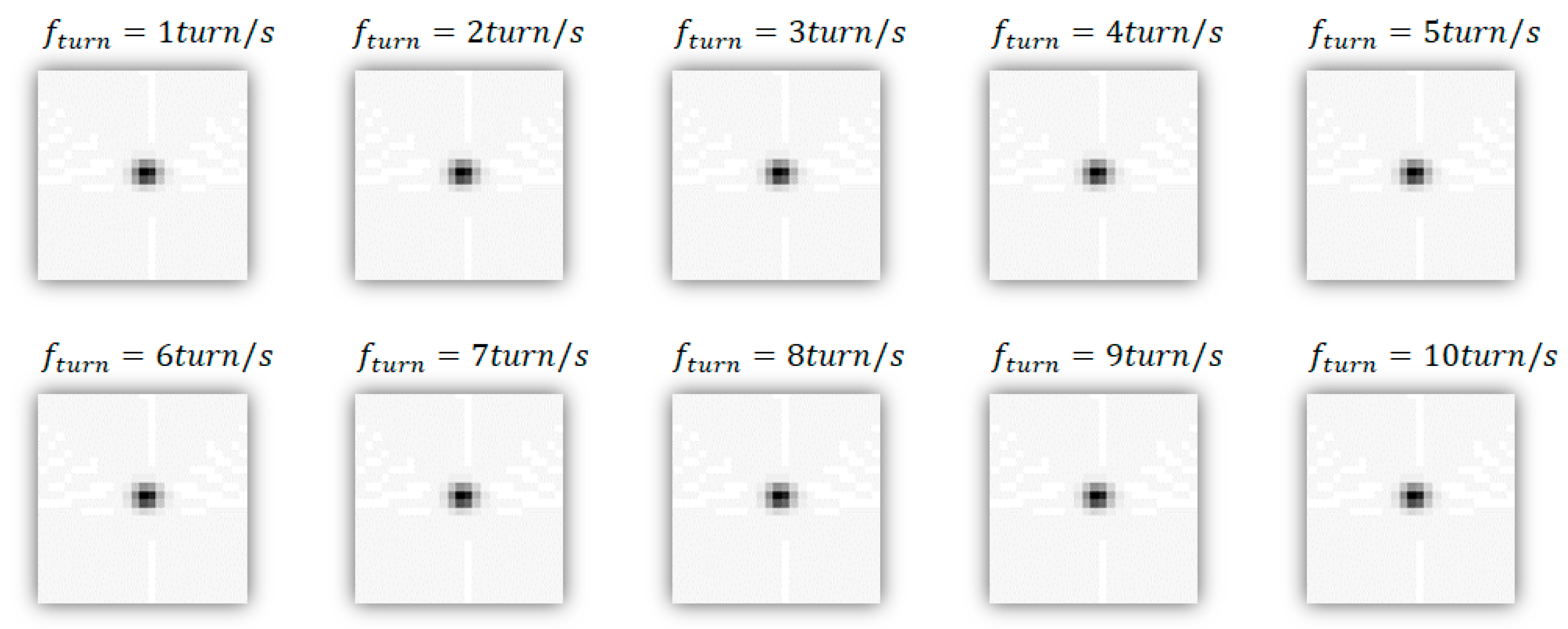Figure 22. Reconstruction of images of an inclusion placed on a rotating platform at a distance of 5 cm from the center of rotation, at an angle of 0° to the ultrasound probe, for rotation frequencies of 1 rps to 10 rps.