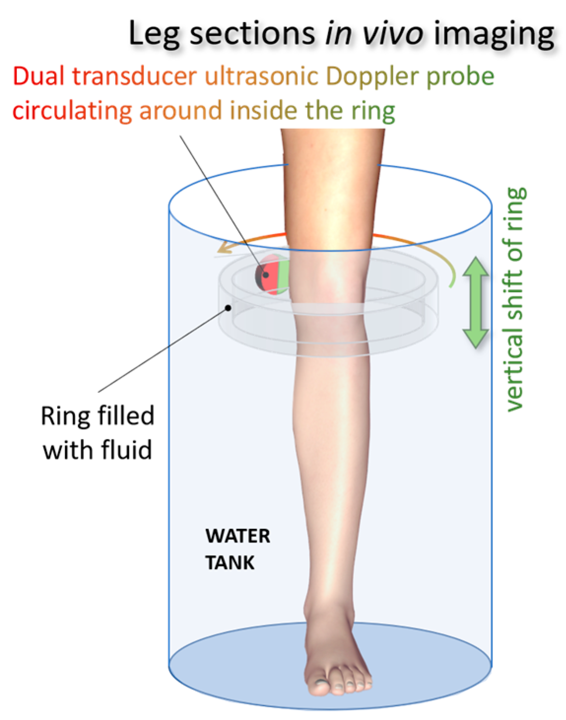 In practical measurements, the Doppler ultrasound probe moving around the object under investigation should be acoustically coupled to the object so that the transmitted and received ultrasound wave is not significantly weakened by propagation to and from the object. The cheapest and best medium for this purpose is readily available water. Due to possible errors associated with the movement of water around the object caused by the rapid rotation of the transducer, the best solution would be to place the transducer in a sealed, thin-walled ring filled with a suitable fluid of low viscosity in which it could rotate. Acoustic coupling between the surface of the ring and the object under test can be provided by immersing the ring and the object in a tank of water (Figure 24).