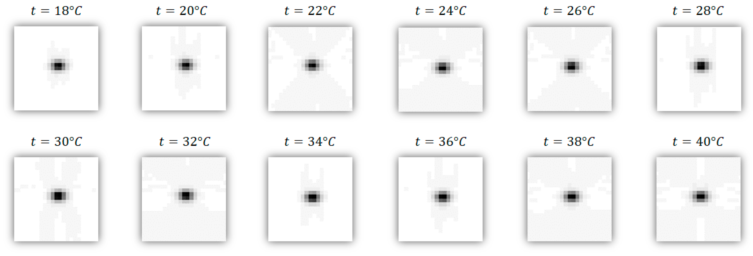 Figure 26. Reconstruction of images of an inclusion placed on the rotating platform at a distance of 5 cm from the center of rotation at an angle of 0° to the ultrasonic probe, for a water temperature t from 18 °C to 40 °C.
