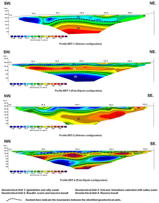 11]. This feature makes ERT especially suitable for volcanic islands characterized by complex “layer-cake” stratigraphy with multiple lava flow units, where alternating high and low resistivity layers enhance subsurface discrimination. Recent studies have demonstrated the effectiveness of ERT in identifying marine intrusion in coastal aquifers of diverse geological nature, ranging from carbonate systems to alluvial formations [