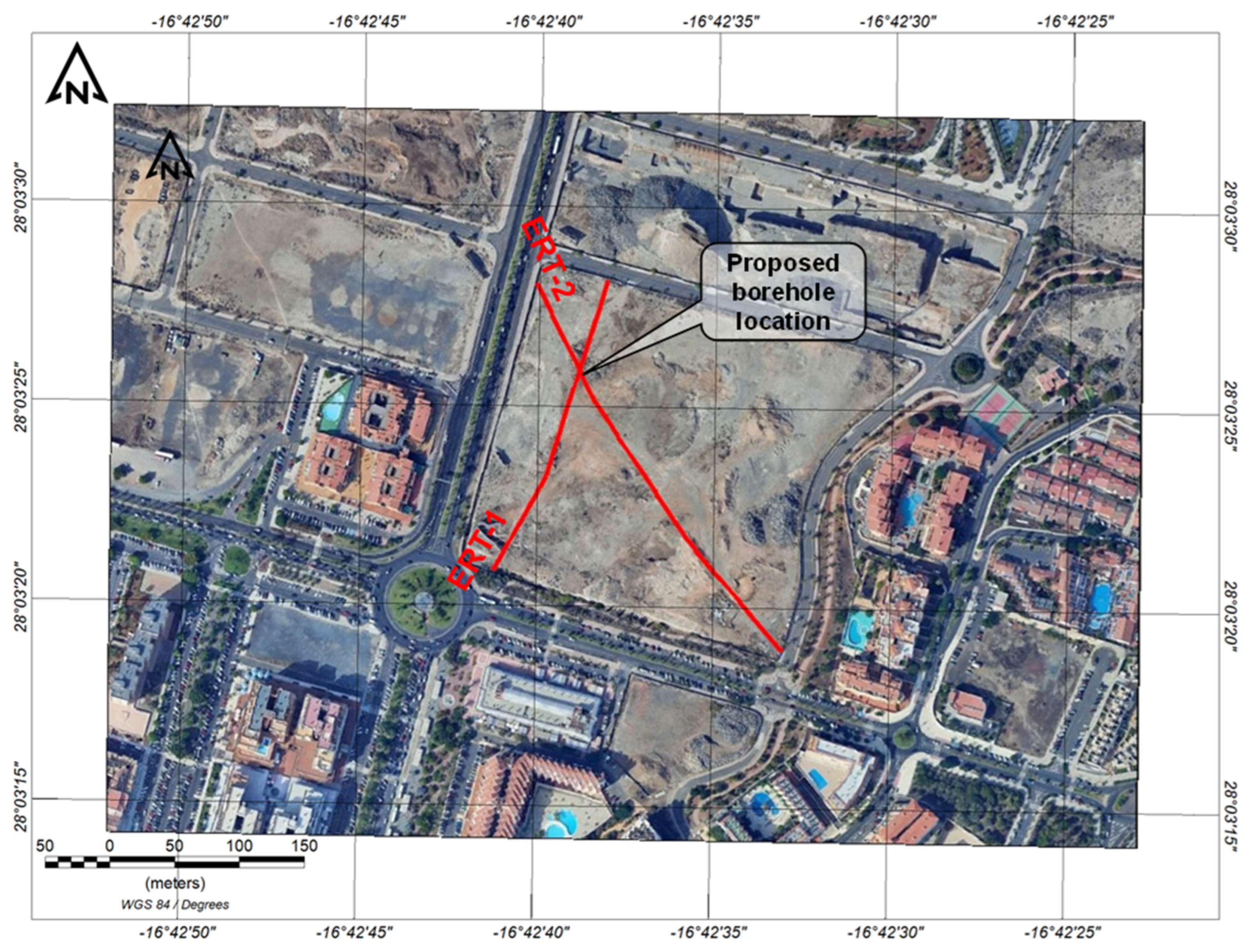 In the specific case of the Los Cristianos site, the preselected drilling area has proven suitable, although it is estimated that reaching a slightly greater depth than in other parts of the plot will be necessary to intercept the most representative thickness of the conductive domain. This adjustment in the projected drilling depth will increase the likelihood of success, ensuring sufficient yield and water quality suitable for desalination, thereby reinforcing the practical utility of the methodology applied in this study.