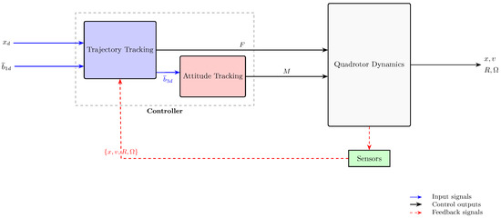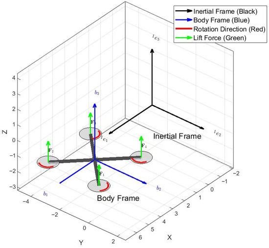 Herein, c R 3 denotes the position of the airframe’s center of mass in the inertial coordinate system; v R 3 denotes the velocity of the airframe in the inertial coordinate system; m R denotes the total mass of the UAV; R SO ( 3 ) denotes the rotation matrix from the body coordinate system to the inertial coordinate system; and Ω R 3 denotes the angular velocity of the quadrotor in the body coordinate system.