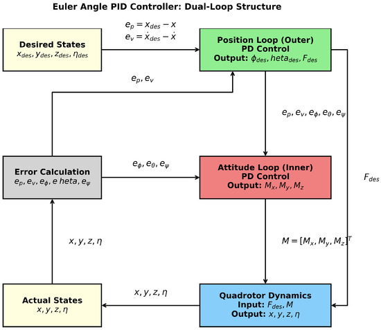 The Euler angle controller decomposes the quadrotor attitude into roll angle ( ϕ ), pitch angle ( θ ), and yaw angle ( ψ ), implementing a dual-loop structure of “outer-loop position control—inner-loop attitude control” based on Newton–Euler equations. Its core innovation lies in simplifying the nonlinear dynamic model through linearization approximation to achieve hierarchical control of position and attitude.