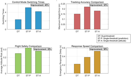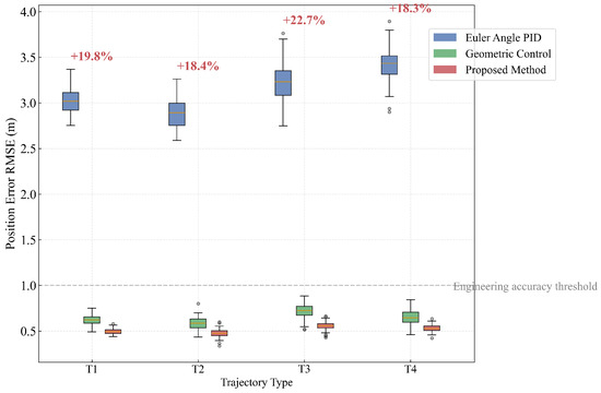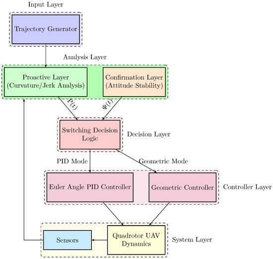 The remainder of this paper is structured as follows: Theoretical Background details the quadrotor dynamics model (coordinate systems, physical parameters, dynamic equations), Euler angle PID controller (linearization assumptions, dual-loop structure), geometric controller (SE(3)-based error definition, global stability proof), and focuses on the hierarchical dual-threshold switching mechanism (biological inspiration, proactive/confirmation layer indicators, collaborative logic); Research Methods clarifies the control algorithm implementation (layer indicator calculation, dual-threshold switching with hysteresis protection), simulation experiment design (platform configuration, dynamic/controller parameters, four typical trajectories), and core evaluation indicators (position error RMSE, energy consumption, CPU time); Results presents simulation outcomes, including proactive layer threshold ( P t h ) calibration (false switching rate, response delay), multi-method comparisons on T1–T4 trajectories (quantitative + visualized tracking), and verification vs. single-threshold methods (response speed, false switching rate); Discussion analyzes the proposed method’s advantages (optimizations for position error, energy, CPU time), expounds its academic (bio-inspired dual-layer mechanism, quantitative framework) and engineering value (endurance extension, embedded platform adaptation), notes limitations (simulation-only, fixed CoG), and proposes future directions (multi-disturbance compensation, physical validation, multi-UAV extension); Conclusions summarizes the solution to the “precision–energy–real-time” constraint, confirms filled research gaps, and emphasizes significance for resource-constrained quadrotors in complex environments.